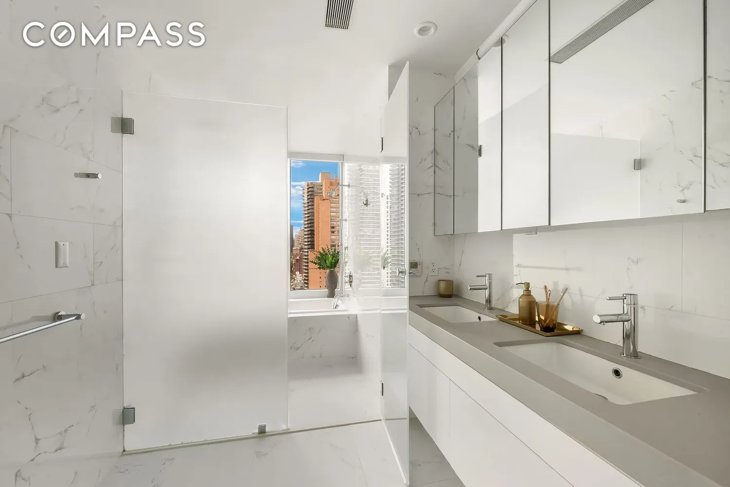 The master bathroom is outfitted with Carrara Blanco-style marble floors and marble wall tiles by Porcelanosa. A Kohler soaking tub and open shower – with a modesty partition in frosted glass – are serene counterpoints to the extra-large gray quartz countertop with double sink, custom white matte lacquered vanities, generous medicine cabinet, and Watermark features.