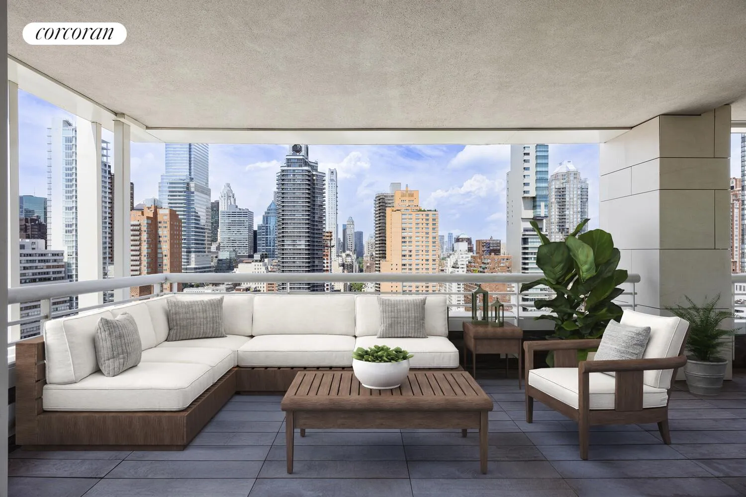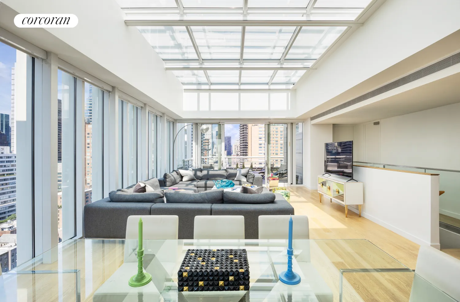 Chefs will gravitate towards the open gourmet kitchen featuring sleek Scandinavian custom cabinetry, rich marble, and a fleet of upscale Gaggenau and Miele appliances. The massive waterfall island is the perfect perch for casual meals and conversation overlooking the East River and 59th Street Bridge. A secondary suite on this level offers terrace access, making it ideal as a study, home office or guest accommodation. Head upstairs to discover the home's crowning glory - a glorious roof deck with breathtaking views that stretch across the city skyline.