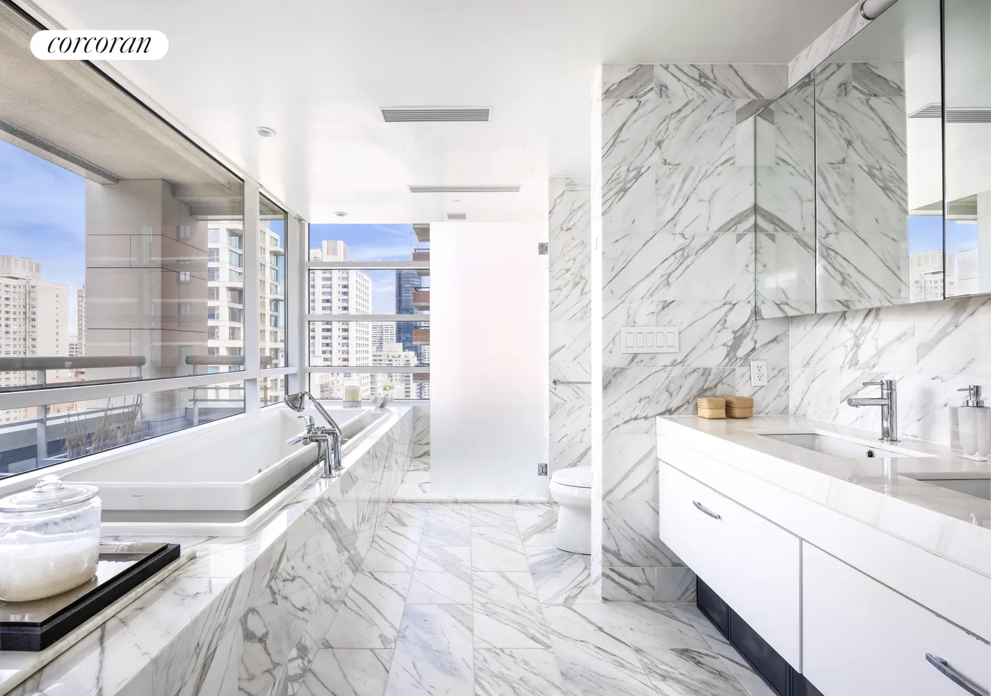 Three more en suite bedrooms are tucked on the home's private lower level, including the palatial owner's retreat. Here, the king-size bedroom is wrapped in southern and western exposures, a walk-in custom closet, a row of wardrobes and a spectacular sunset terrace. In the owner's spa bathroom, a deep-soaking infinity bathtub, separate shower, and floating double vanity are surrounded by radiant heated floors, walls of glass and floor-to-ceiling marble. Two secondary suites, including one with its own terrace, are joined by a laundry room, making laundry day effortless in this work-of-art uptown home in the sky.