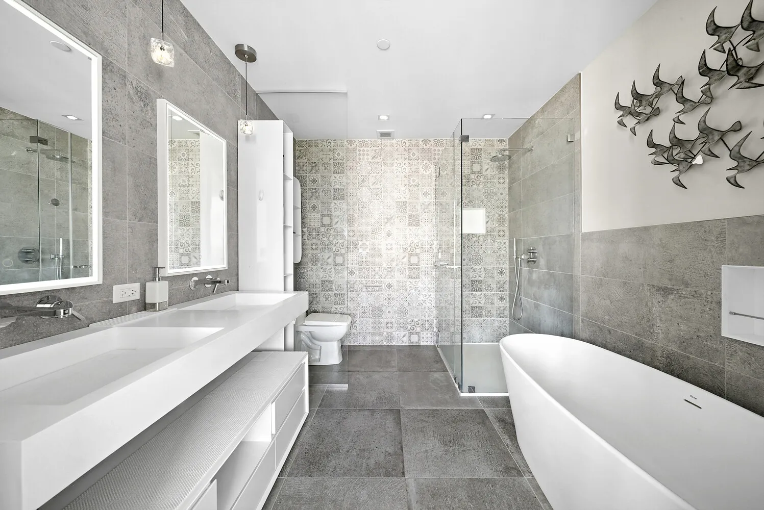 Primary Suite: Expansive north-facing windows, generous closets, and a spa-like en-suite bath with a double vanity, deep soaking tub, rainfall shower, radiant heated floors, and mosaic tiling.