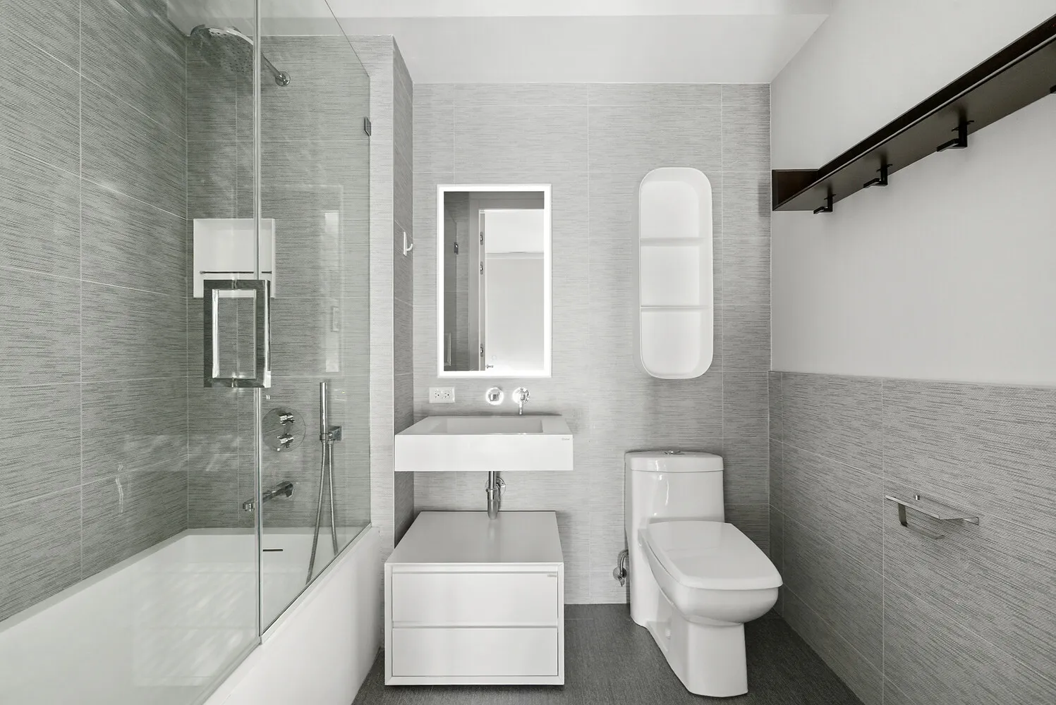 Third Bedroom / Home Office: A versatile space with an adjacent full bath featuring a glass-enclosed shower and radiant heated floors.