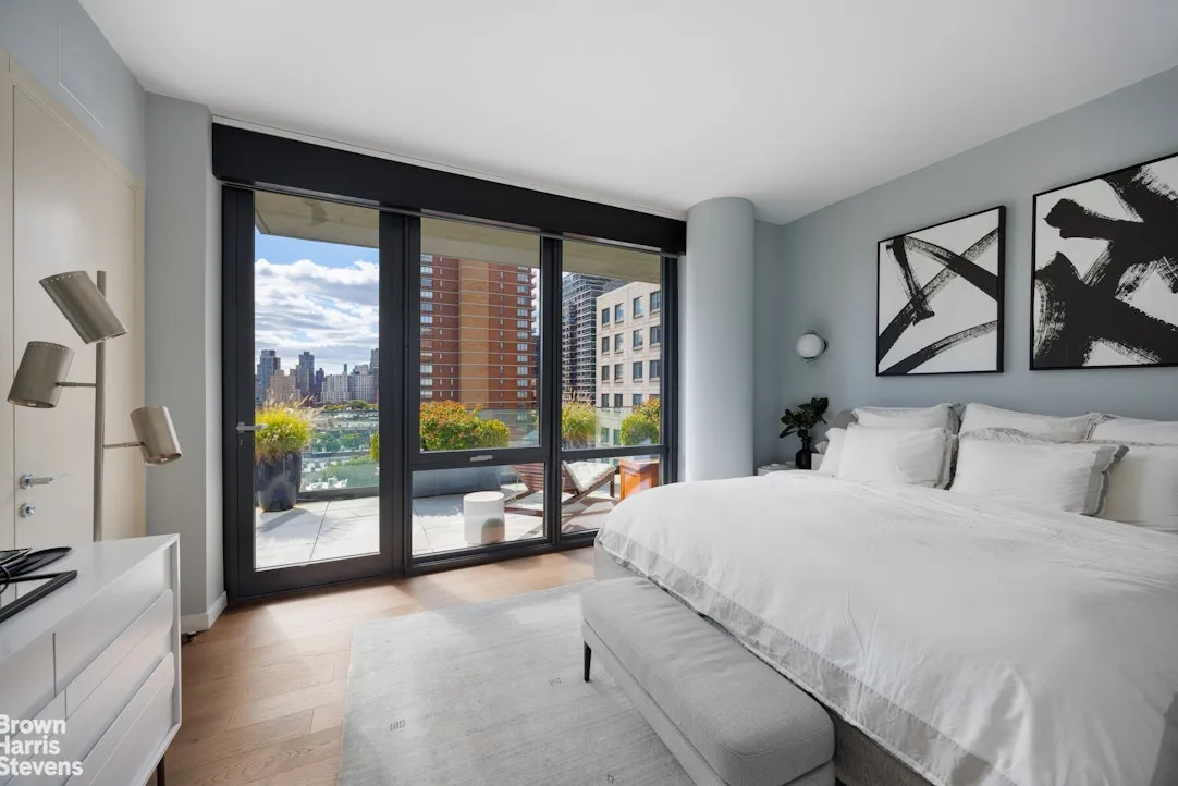 The living/dining room and very generous open kitchen with its 12-foot Carrera marble floating kitchen island are the stuff of dreams. Such a room is unique not just for its scale, but also for its ceiling height, glass curtain wall, and connected 500sf north-facing landscaped terrace. Your eyes are drawn to the unobstructed views, including those of Central Park and the East River, making it supremely practical and a visual joy, directly connecting you with the city at all times of the day and year.