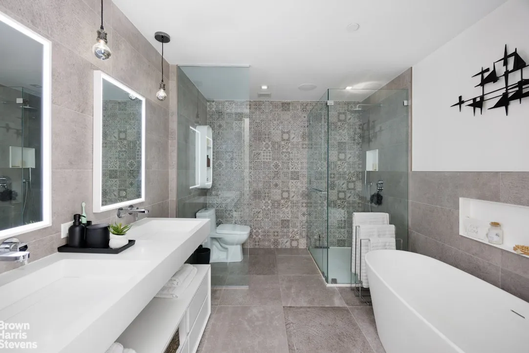 The primary bedroom has an exceptionally comfortable ensuite with a free-standing tub, enormous walk-in shower, walk-in closet with its own full wall of windows, and access to the second terrace.
