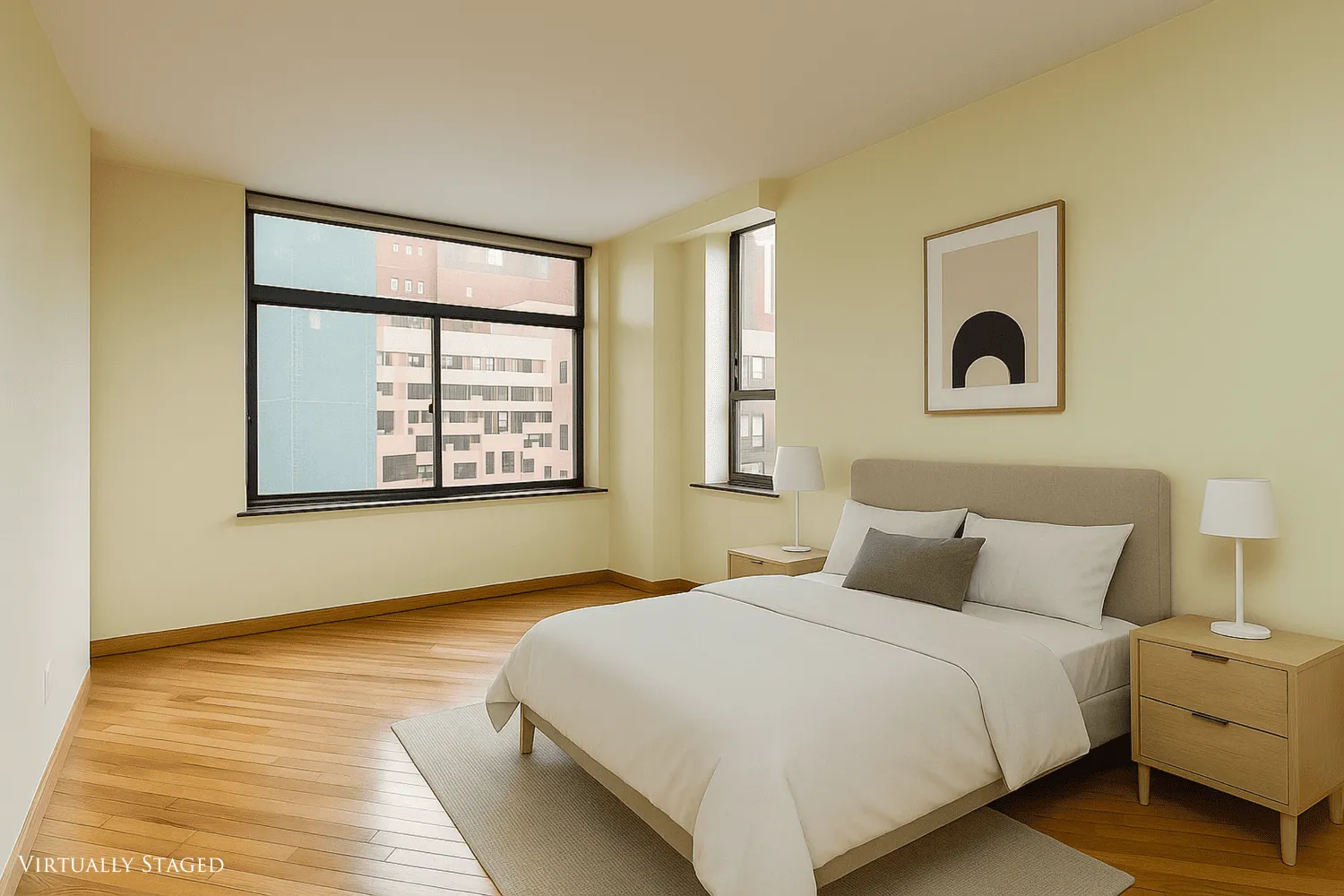 The intelligent split-bedroom layout ensures exceptional privacy and tranquility. The oversized primary suite is a serene retreat, boasting beautiful Western views, ample custom closets, newly installed wood floors, and a luxurious en-suite bath complete with refined fixtures, a deep soaking tub, and custom marble vanity. The primary suite also includes a custom built-in desk, perfect for remote work or study. The second bedroom is equally impressive, offering bright corner exposures (N/E) and inspiring skyline views.
