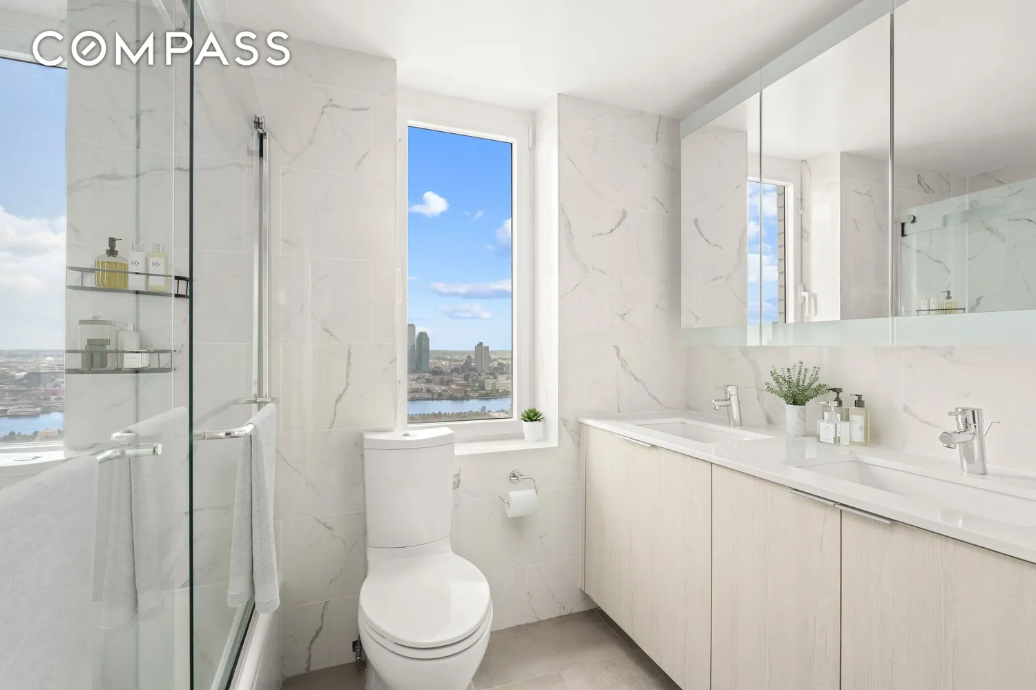 The primary cornered bedroom suite offers stunning Southern and Eastern views, tremendous closet space and a beautifully appointed en-suite bathroom with a double sink vanity. The second largest bedroom also is situated on a corner offering double sweeping exposures. Each bathroom throughout the home is equally luxurious featuring modern European style suspended wood custom vanities with Compac Absolute Blanc vanity tops. Residence 41G boasts 2 additional King-sized bedrooms each with their own bathroom and there is an additional powder room for guests.