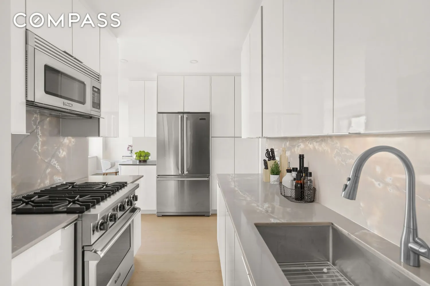 The large chef's kitchen with a designated breakfast area is a culinary dream. The modern kitchen features top of the line Viking stove, Calacatta polished stone countertop and backsplash, as well as stainless steel integrated appliances.