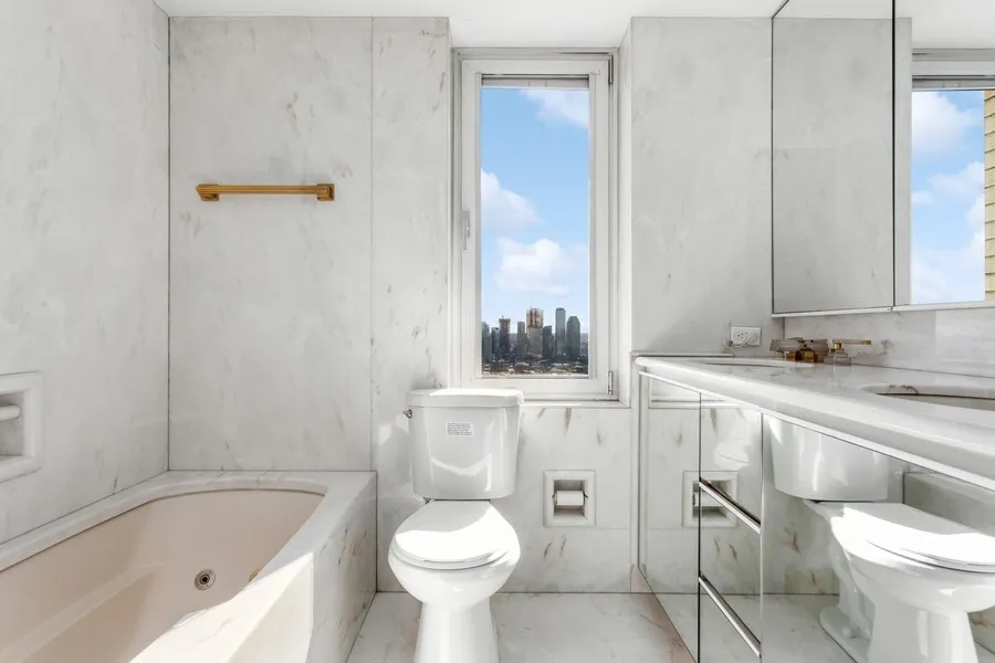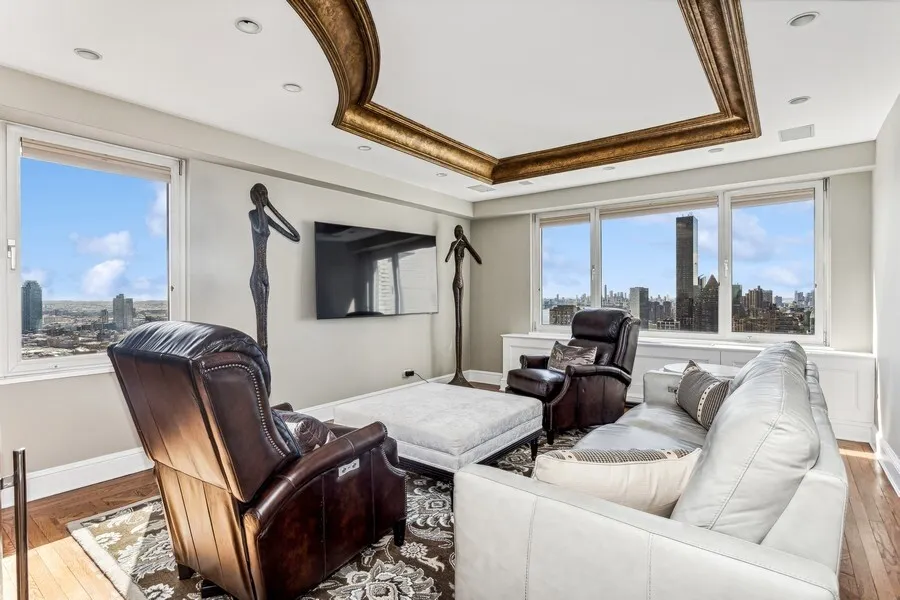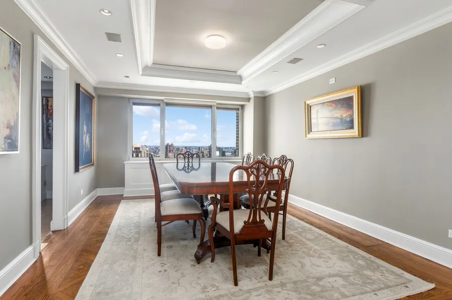 Perched on the 45th floor of the Excelsior, this two bedroom/convertible four offers spectacular views of the iconic New York City skyline from every room and an over-sized balcony to enjoy the city landmarks al fresco. With triple exposures, north, east, and west, and 3300 square feet of well proportioned space, you feel like you own a house in the sky. Enter to a spacious foyer outfitted with several closets, including a cedar one, and powder room which leads to the dramatic fourteen foot gallery with cove lighting. From this vantage you can look north to the formal dining room or south to the grand living room. The massive sun-flooded living room accommodates a variety of seating options and access to the south-facing balcony with views of the Chrysler Building, midtown Manhattan, and the East River. To the left of the living room is the potential third bedroom which is currently being used as a media room thereby doubling the entertainment space. This room features double exposure windows, a wet bar with wine cooler, refrigerator, and sink, as well as access to one of the home's three and half baths. To the right of the living room is the charming primary bedroom complete with beautifully crafted wood built-ins, a marble ensuite bath, and a tremendous walk in closet. Across the gallery from the living room is the formal dining room/potential fourth bedroom with views of the bridge and river and ample space for twelve people to dine comfortably. Conveniently located next to the dining room is the well-appointed windowed, eat-in kitchen. The Snaidero designed kitchen offers high gloss cabinetry, beautiful contrasting granite counters, a large peninsula, high-end appliances, and a wall of pantry cabinetry. Beyond the kitchen is the laundry room with full size, side by side ,washer and dryer, sink, and huge walk in closet. In the northeast corner of the apartment lies the second bedroom and third full bathroom both with views to the east.