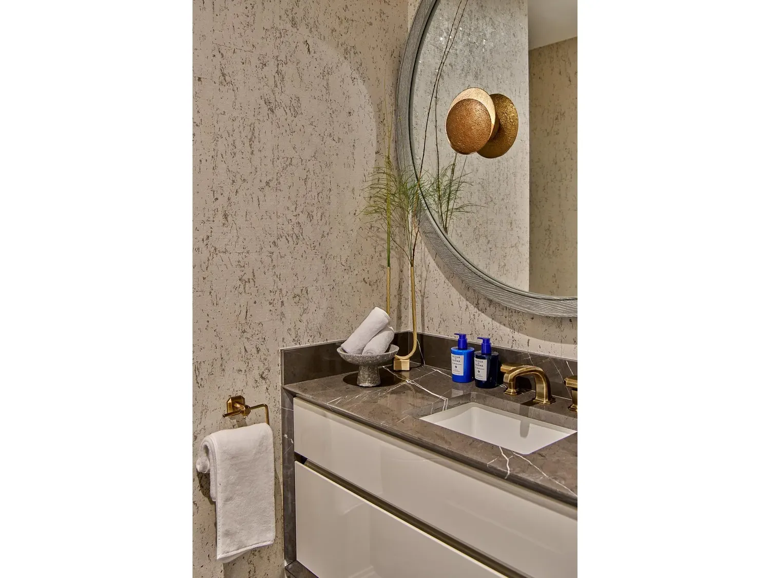 The powder room, located discreetly off the foyer, features a wall-mounted marble vanity and antique bronze fixtures.