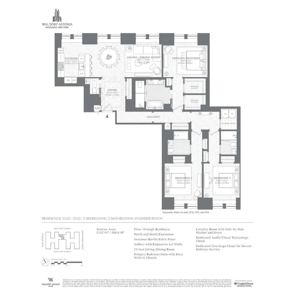 Own a piece of the legacy at Waldorf Astoria Residences New York. Residence 2020 is a 2217 SF three-bed, three-and-a-half-bath, overlooking St Bartholomew's Church and the Chrysler Building.