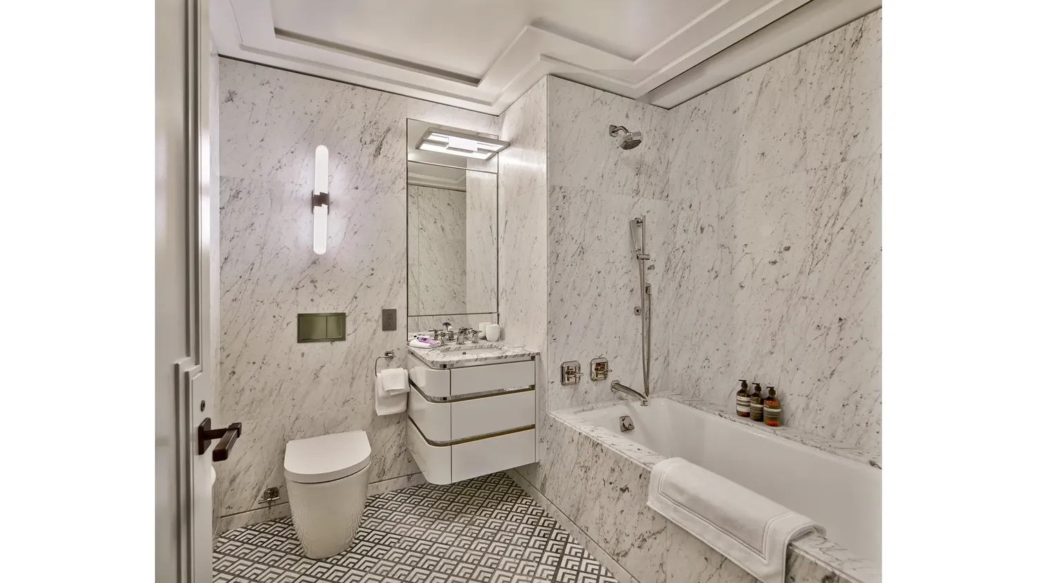 The elegant bathroom features floor-to-ceiling honed white Bianca Carrara marble slab walls and radiant heated custom designed mosaic marble tile floor. A custom double vanity with polished Luna Gray marble countertop, elegant stainless-steel legs, and integrated lighting provides exceptional storage complementing the cabinet with integrated lighting, mirror and concealed electric outlet. The bathtub and walk-in shower features fixtures and fittings that are custom forged in polished nickel, exclusively for Waldorf Astoria Residences