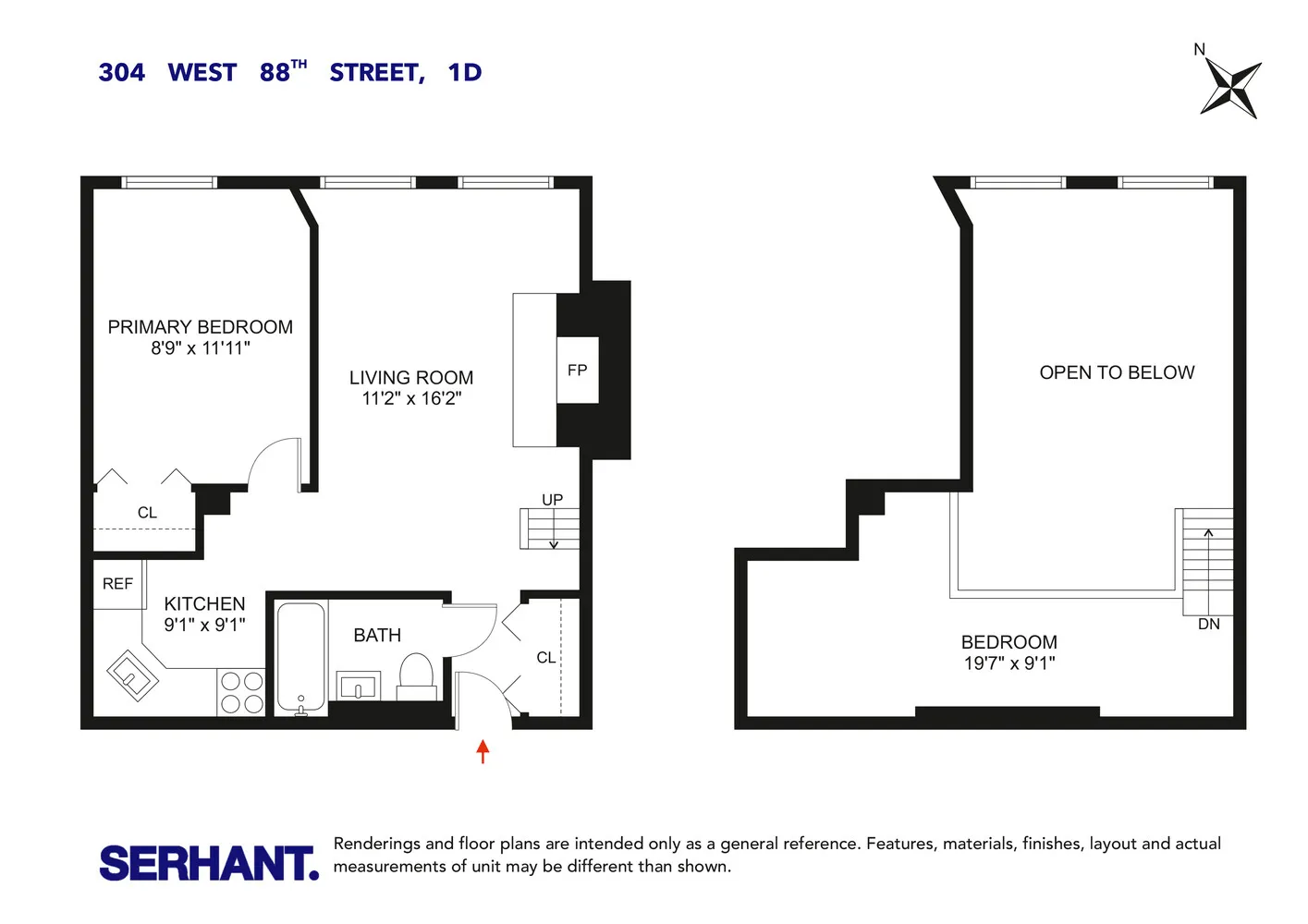 This one-of-a-kind residence features dramatic double-height ceilings and a versatile sleeping loft, perfect for added living space, storage, or effortlessly hosting guests. Oversized north-facing windows bathe the home in natural light, accentuating the stunning exposed brick walls, soaring ceilings, and a wood-burning fireplace that brings together classic pre-war character and modern comfort.