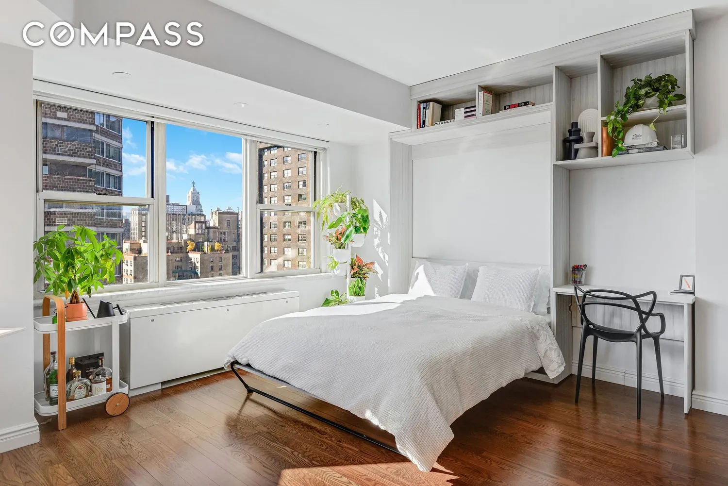 The modern Queen sized Murphy bed with built in desk and shelving is sleek and clever, seamlessly integrating into the wall. The clean lines maintain the minimal and sophisticated aesthetic throughout as well as maximizing every inch of your penthouse studio.