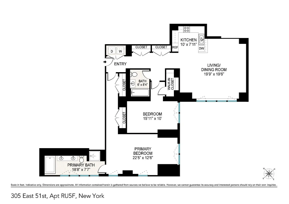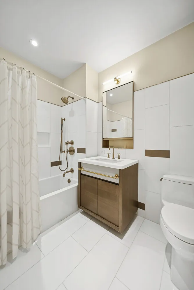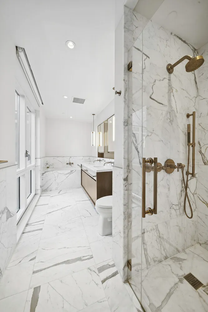 The corner primary suite enjoys Eastern and Northern exposures with tranquil brownstone garden views. The marble en suite bath features double sinks, a separate glass enclosed shower, and a deep soaking tub. Blackout shades with upgraded hardware provide enhanced privacy and comfort.