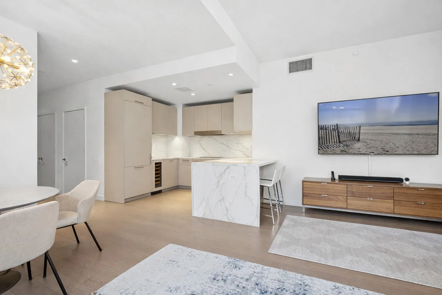The chef's kitchen is finished with custom Poliform cabinetry, Calacatta Gold marble countertops, Miele appliances, a Sub Zero wine cooler, and a newly upgraded Kohler faucet. The layout flows effortlessly into the dining area, reinforcing a clean open concept design.