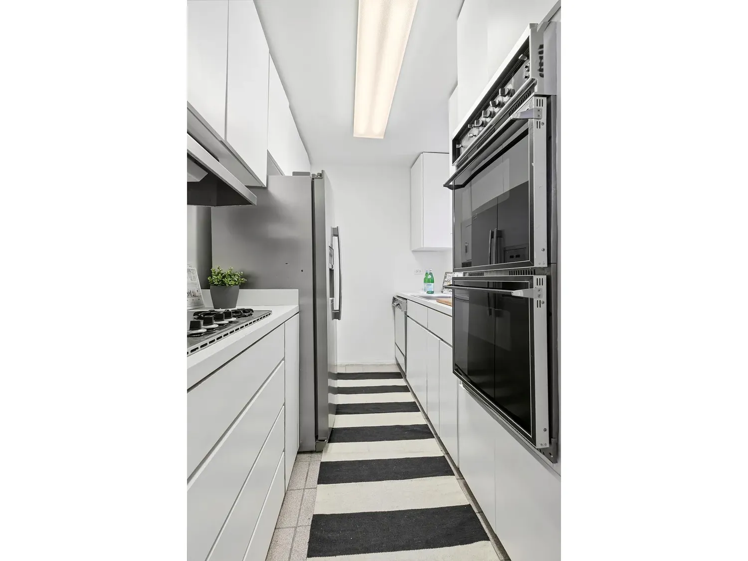 A separate, windowed kitchen provides generous storage and functionality, while the thoughtfully designed split-bedroom layout ensures privacy and comfort. Both bedrooms are oversized with excellent closet space and bright north and south exposures. The apartment also features through-wall air conditioning for year-round climate control.