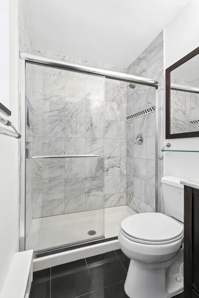 The spacious primary suite includes an oversized closet with customized built-ins and a bathroom with a marble shower. A well-proportioned second bedroom and full bathroom complete the layout. Both bedrooms are pin-drop quiet for secluded sleep or study.