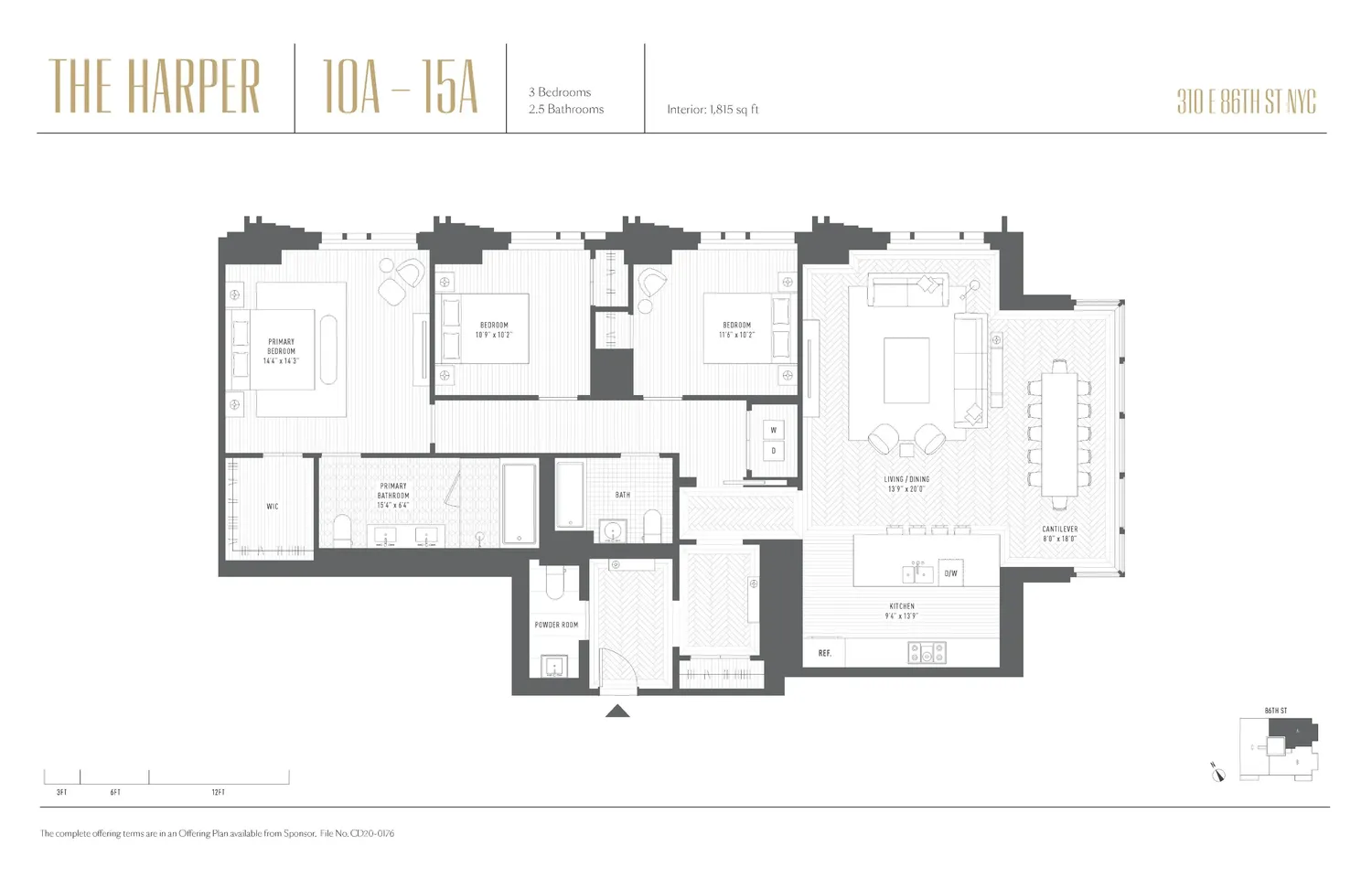 Residence 15A at The Harper is a bright three-bedroom home with northern exposure and a corner great room featuring an expansive, nearly floor-to-ceiling glass cantilever offering views of the surrounding cityscape. Immediately upon entering the home, you are greeted by a gracious gallery and foyer. The open kitchen and living room anchor the home. Custom-designed by Poliform in collaboration with ODA, the kitchen boasts warm matte lacquer cabinetry adorned with antique brass hardware from WaterWorks. The Taj Mahal quartzite countertop and backsplash exude elegance, while Miele integrated appliances offer both exquisite design and top-notch performance.