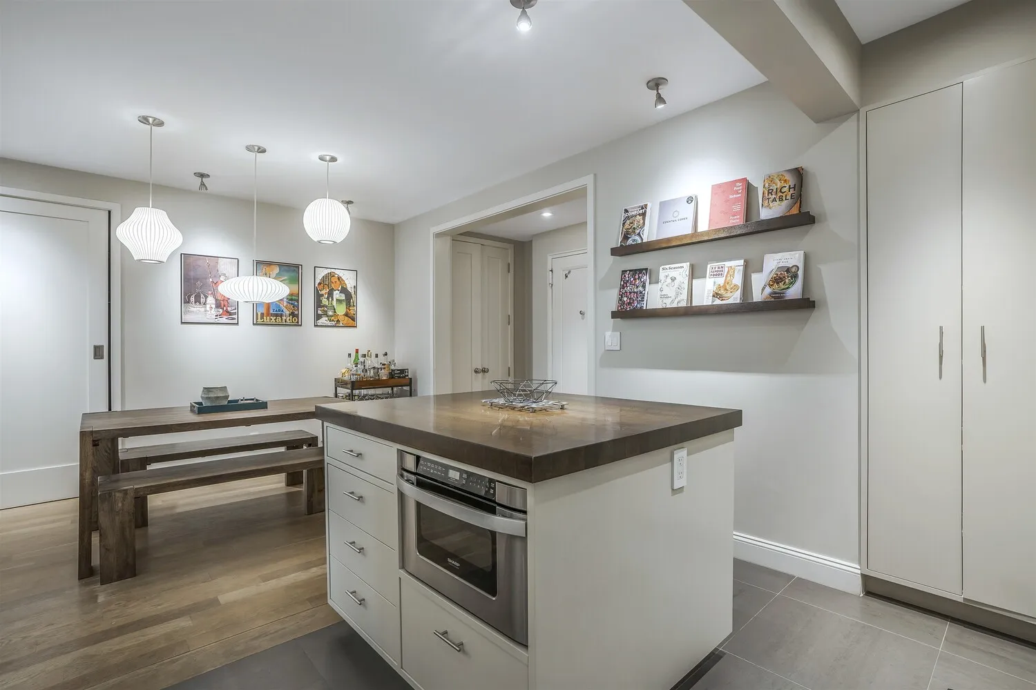 The open layout is designed for both everyday living and entertaining. A custom entry area creates a warm welcome and practical drop zone, while the expansive living and dining space is framed by southern, eastern, and western exposures that fill the home with natural light. The chef's kitchen features a walnut butcher-block island, granite countertops, Thermador appliances, wine storage, and custom cabinetry-perfectly suited for culinary creativity and casual gatherings alike.