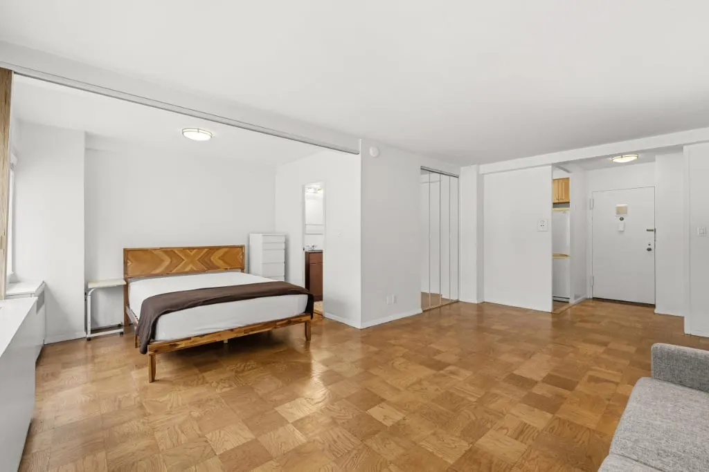 This oversized studio offers windows spanning the entire width of the wall, providing an abundance of light in the large living space and separated alcove. The updated bathroom offers a large vanity, bathtub and additional closet storage. The separated kitchen is equipped with a dishwasher, gas stove, full-sized refrigerator, and more storage than you could hope for.