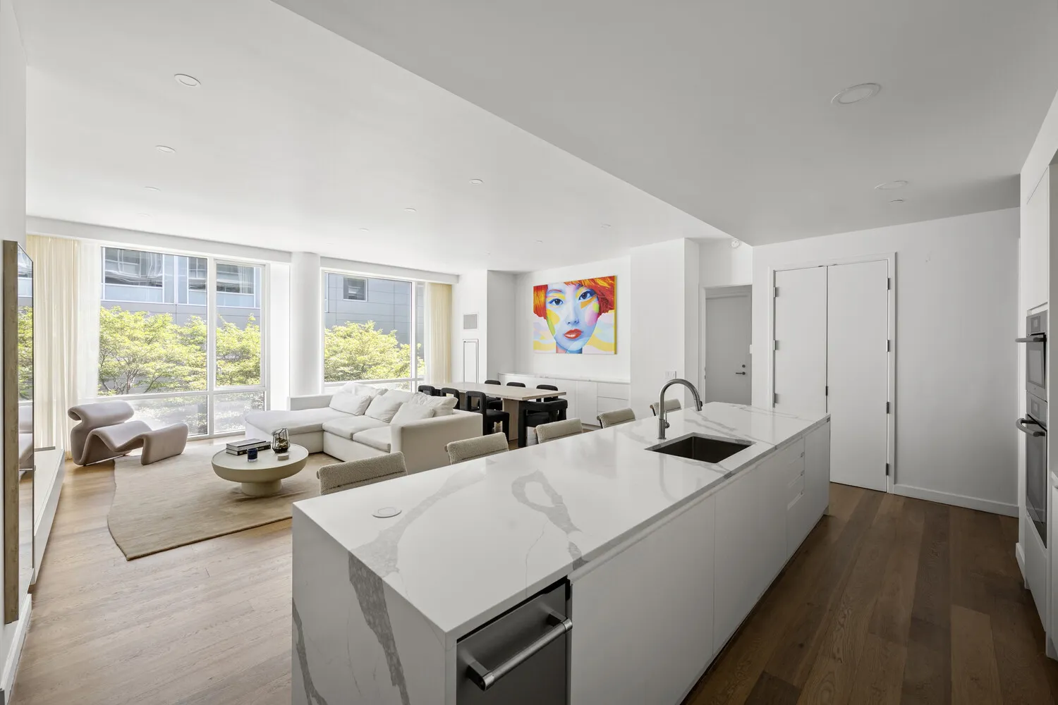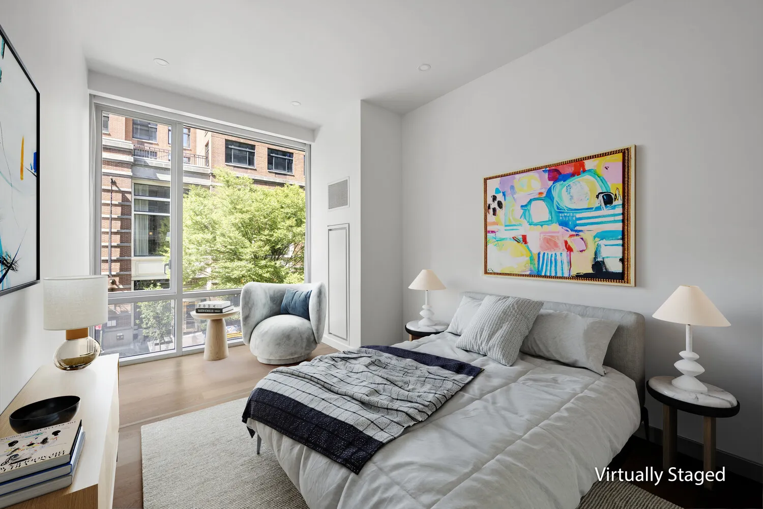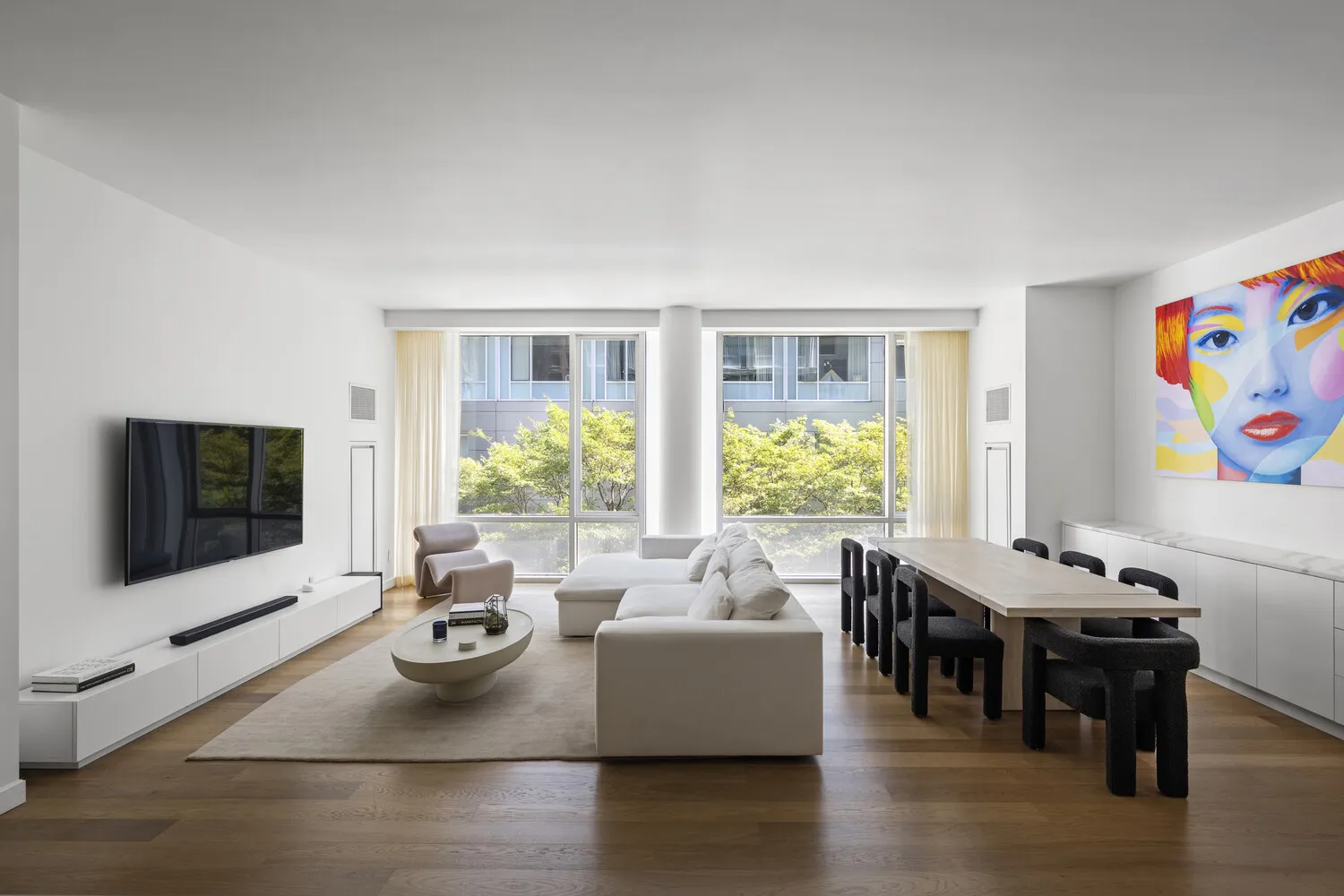 The layout is intelligently designed, with each bedroom fully separated for maximum privacy. The open kitchen is outfitted with sleek Valcucine cabinetry and top-tier appliances from Sub-Zero, Miele, and Gaggenau. The primary suite includes a walk-in closet and a five-piece marble-clad bath with radiant heat, a cast-iron soaking tub, frameless glass shower, and Lefroy Brooks fixtures.