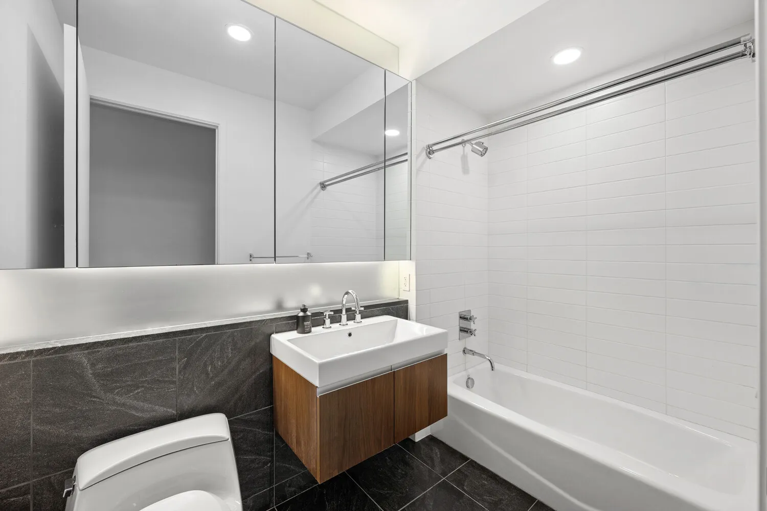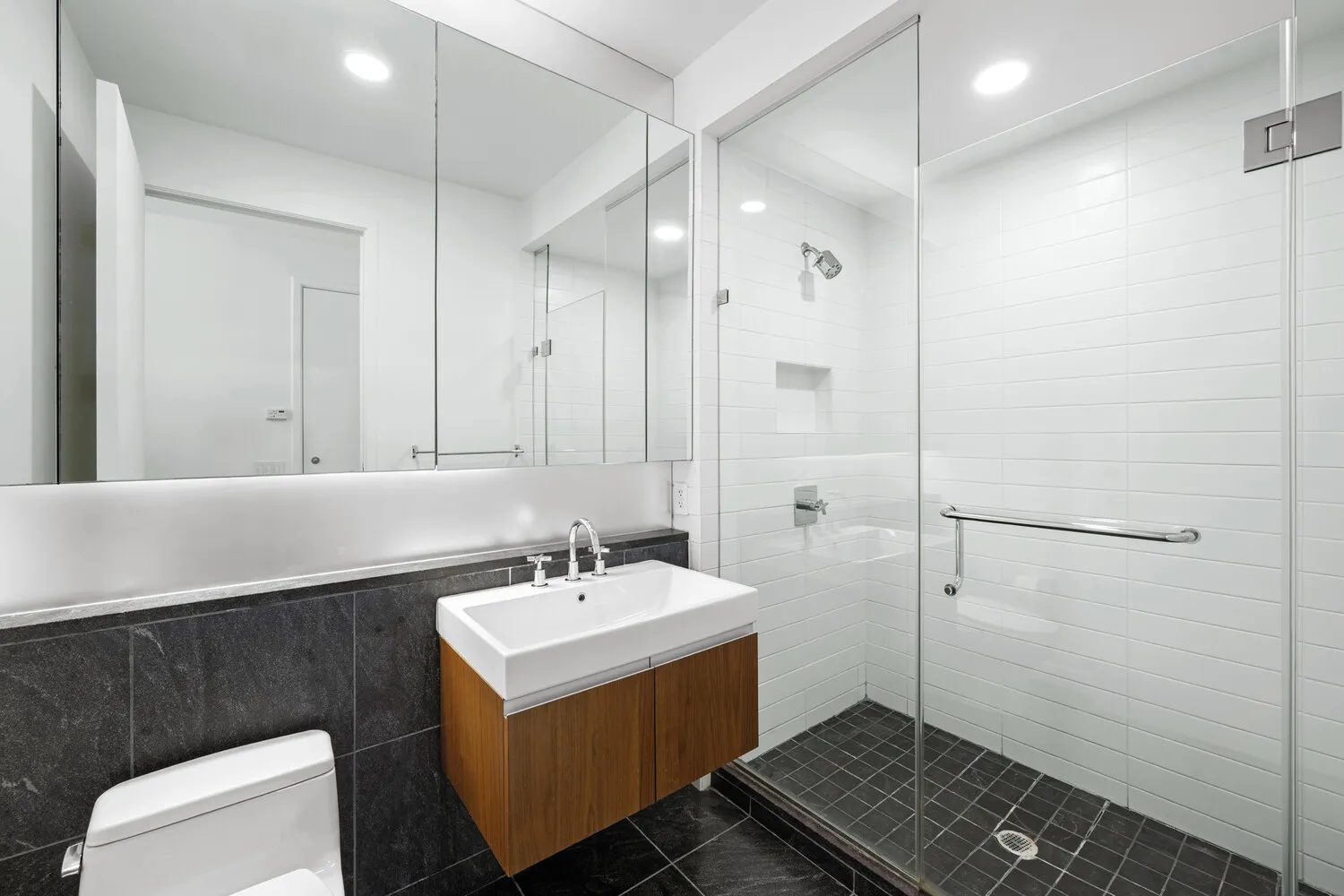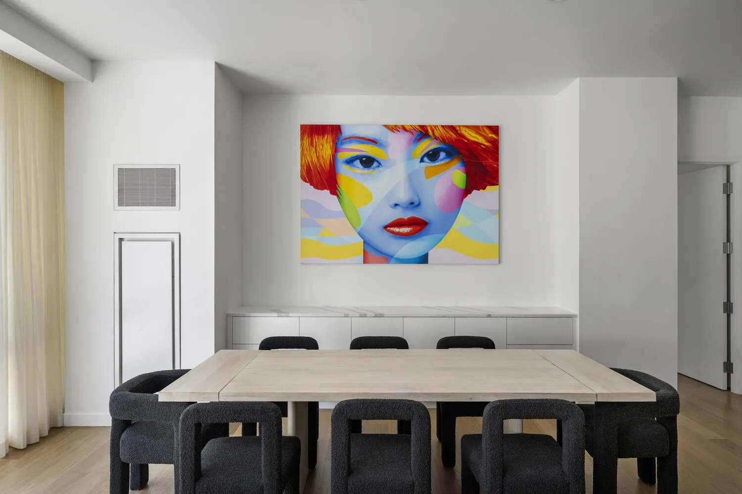 The layout is intelligently designed, with each bedroom fully separated for maximum privacy. The open kitchen is outfitted with sleek Valcucine cabinetry and top-tier appliances from Sub-Zero, Miele, and Gaggenau. The primary suite includes a walk-in closet and a five-piece marble-clad bath with radiant heat, a cast-iron soaking tub, frameless glass shower, and Lefroy Brooks fixtures.