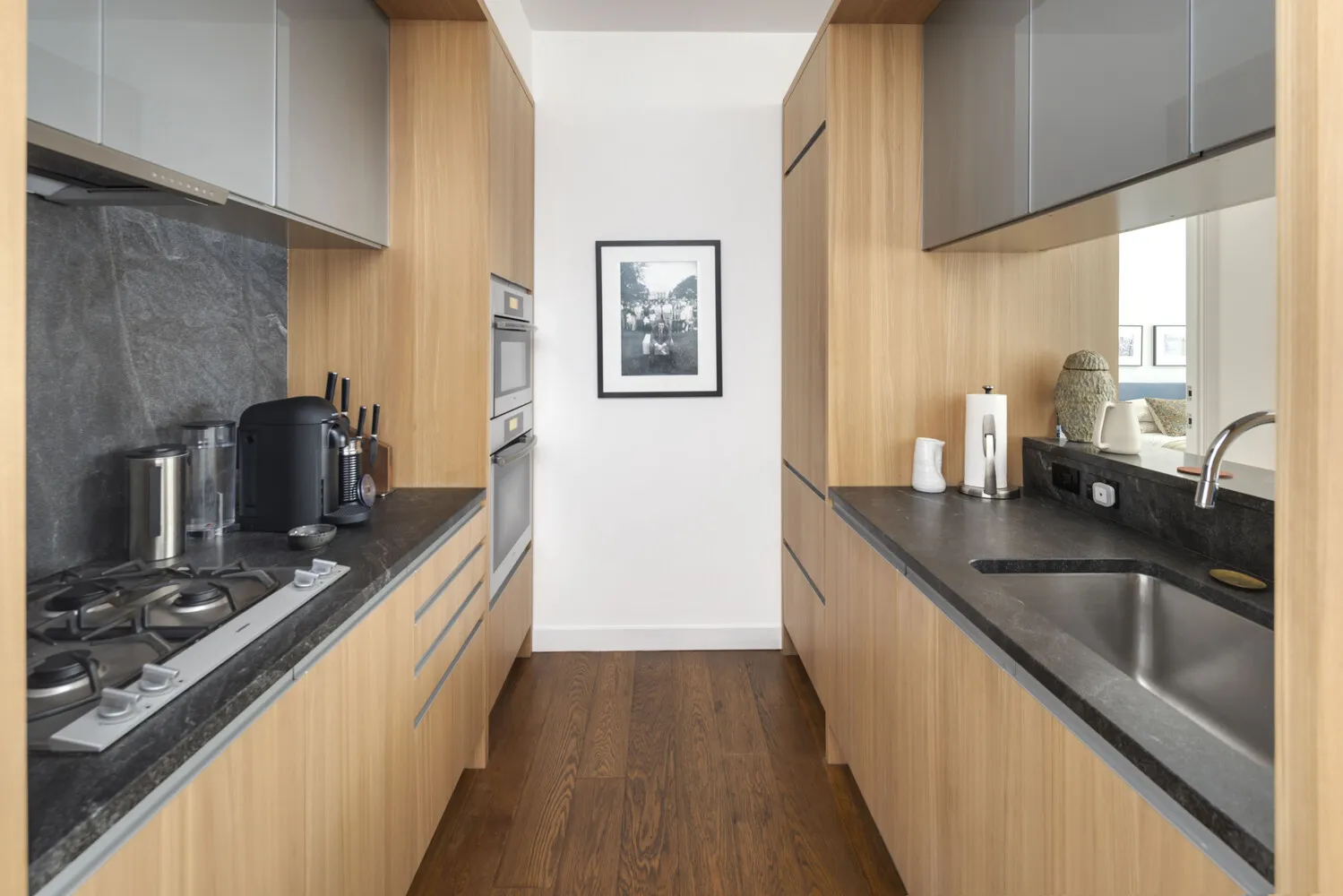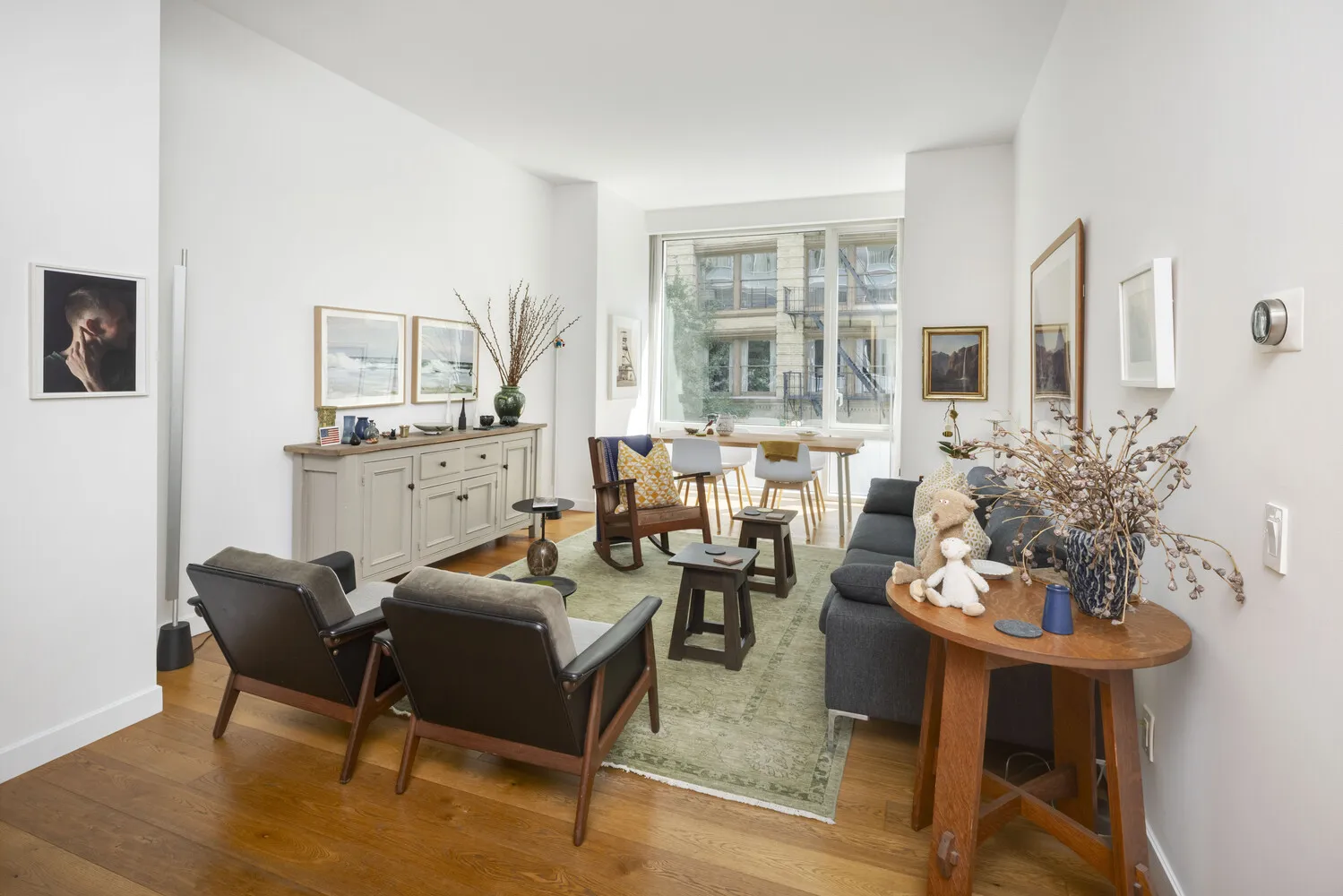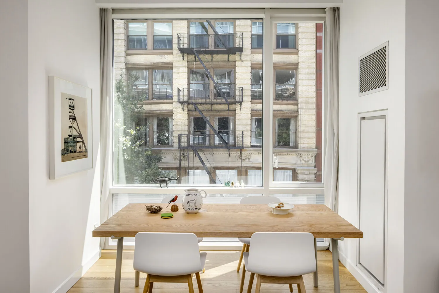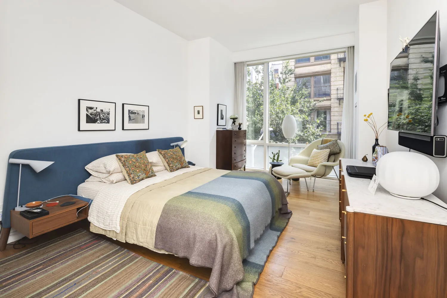 Τucked awaу on the Wooster Street side of the prestigious SoHo Mews condominium, residence #3G is a gorgeously outfitted, 1225 square foot split-2BR apartment that boasts a pitch-perfect layout, towering east-facing windows in all three rooms with fantastic light and treetop/cobblestone street views. The large living room offers tons of sun and plenty of space for entertaining and dining alike; the chef's kitchen, just off the foyer, is exquisitely appointed with Quartz countertops, top-of-the-line appliances from Gaggeneau, SubZero and Miele, a breakfast bar and tons of storage.