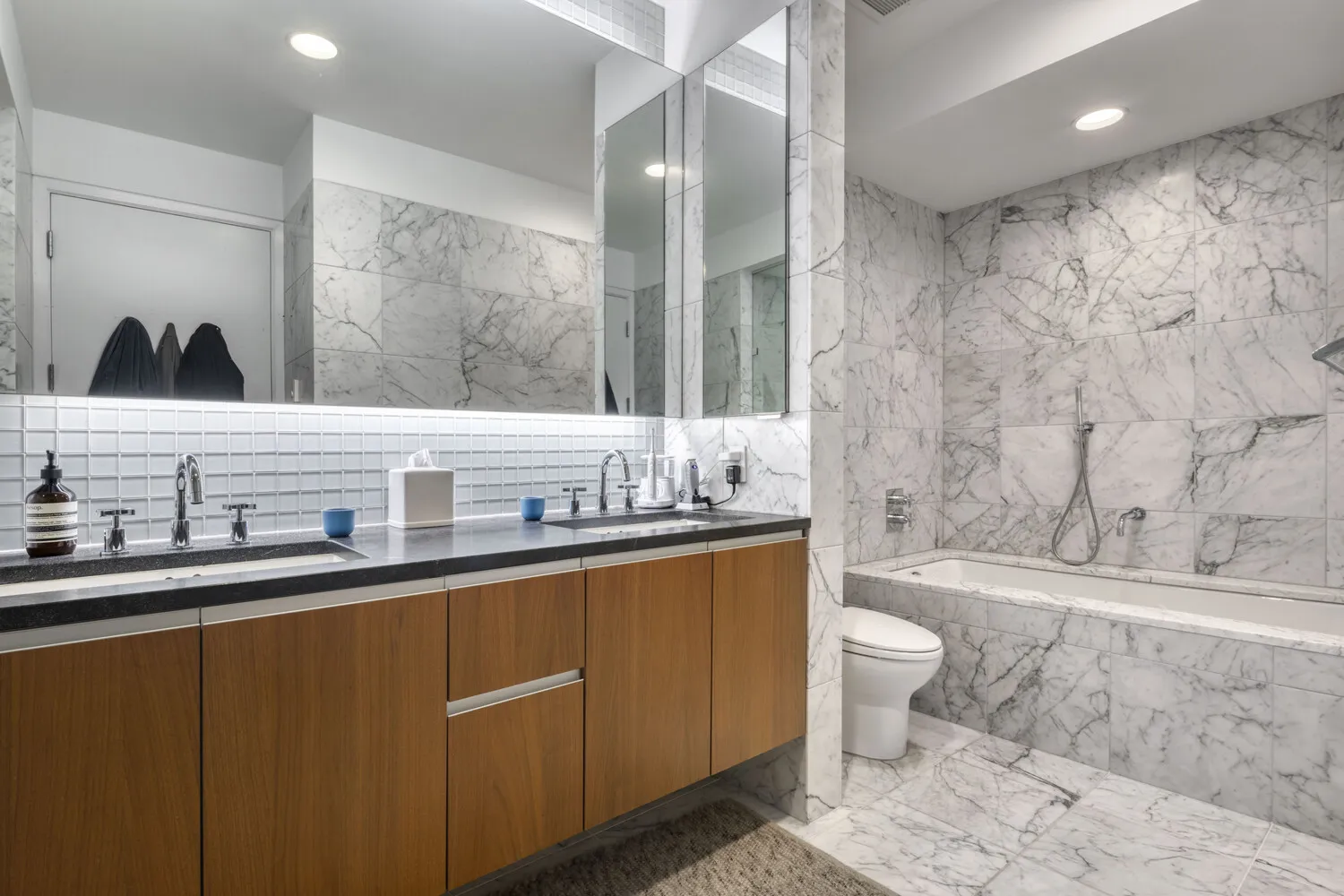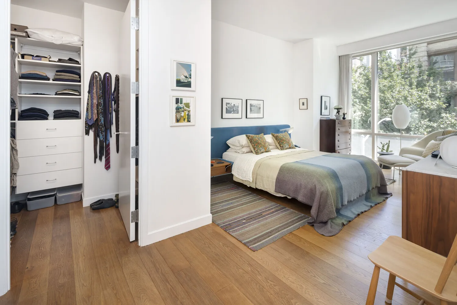 The primary bedroom is equally bright and quiet and features enough space for a king-sized bed set and seating area/office nook; there's also a fully outfitted walk-in closet, en-suite bathroom with radiant floors, separate walk-in shower and soaking tub, double sinks and (still more) plentiful storage! And on the opposite wing of the apartment, you'll find the spacious second bedroom with pocket-door and a lovely second bathroom. Additional perks include custom window treatments, lovely hardwood floors, in-unit W/D and multi-zoned central climate control.