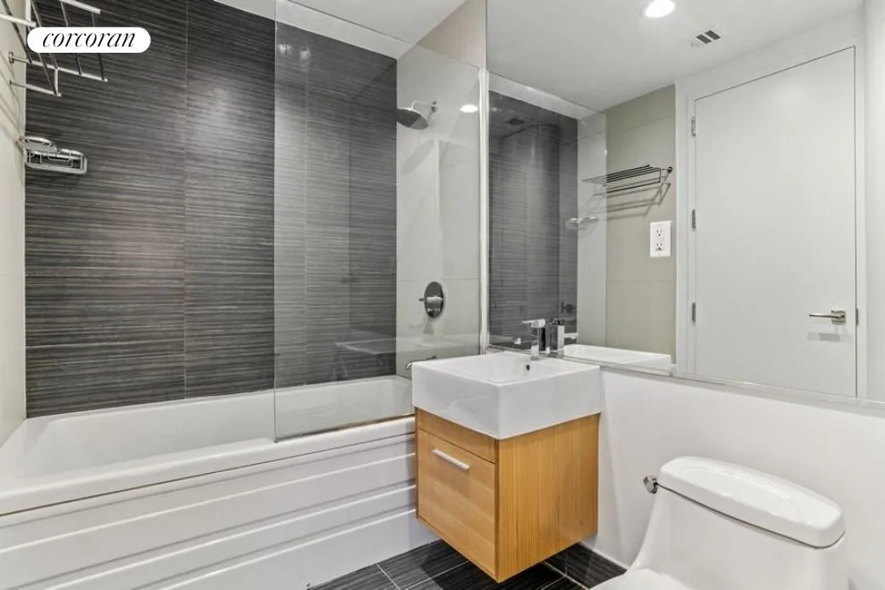 A central multi-use den anchors the layout, offering rare flexibility for a home office, nursery, yoga studio, or formal dining area. The sunlit 1-bedroom floor-through flows effortlessly, featuring wide-plank floors, oversized windows, and clean, modern finishes. The bedroom is a true retreat, complete with exceptional closet storage and direct access to a private balcony-perfect for fresh air and quiet moments. An open kitchen with sleek cabinetry, stone countertops, and stainless-steel appliances pairs beautifully with a spa-like bath outfitted with a deep soaking tub, elegant tilework, and smart storage.