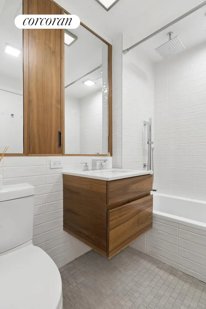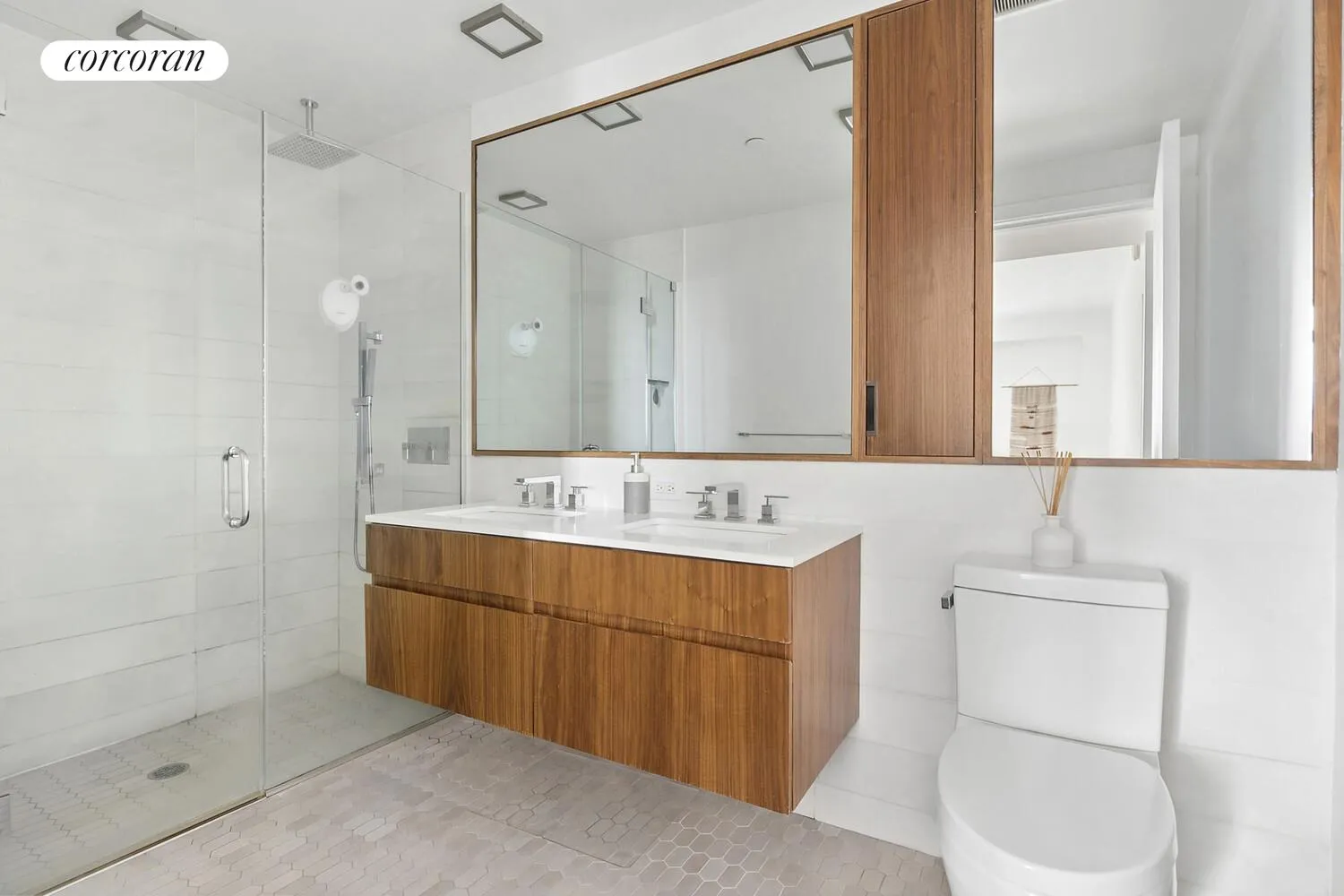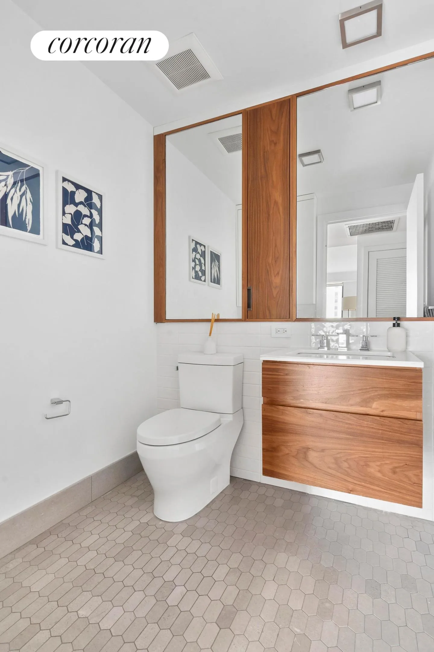 The primary suite serves as a serene escape, complete with generous closet space and a spa-like en-suite bath featuring a walnut veneer dual-sink vanity, pure white Caesarstone countertops and a large walk-in glass shower. The second bedroom is equally well-proportioned with custom closets and its own en-suite bath with a deep soaking tub. A stylish powder room adds convenience for guests.