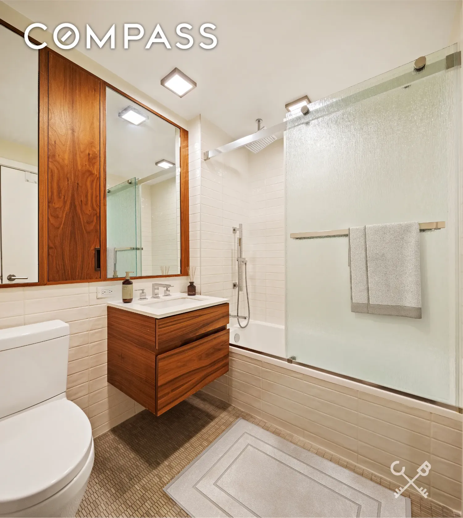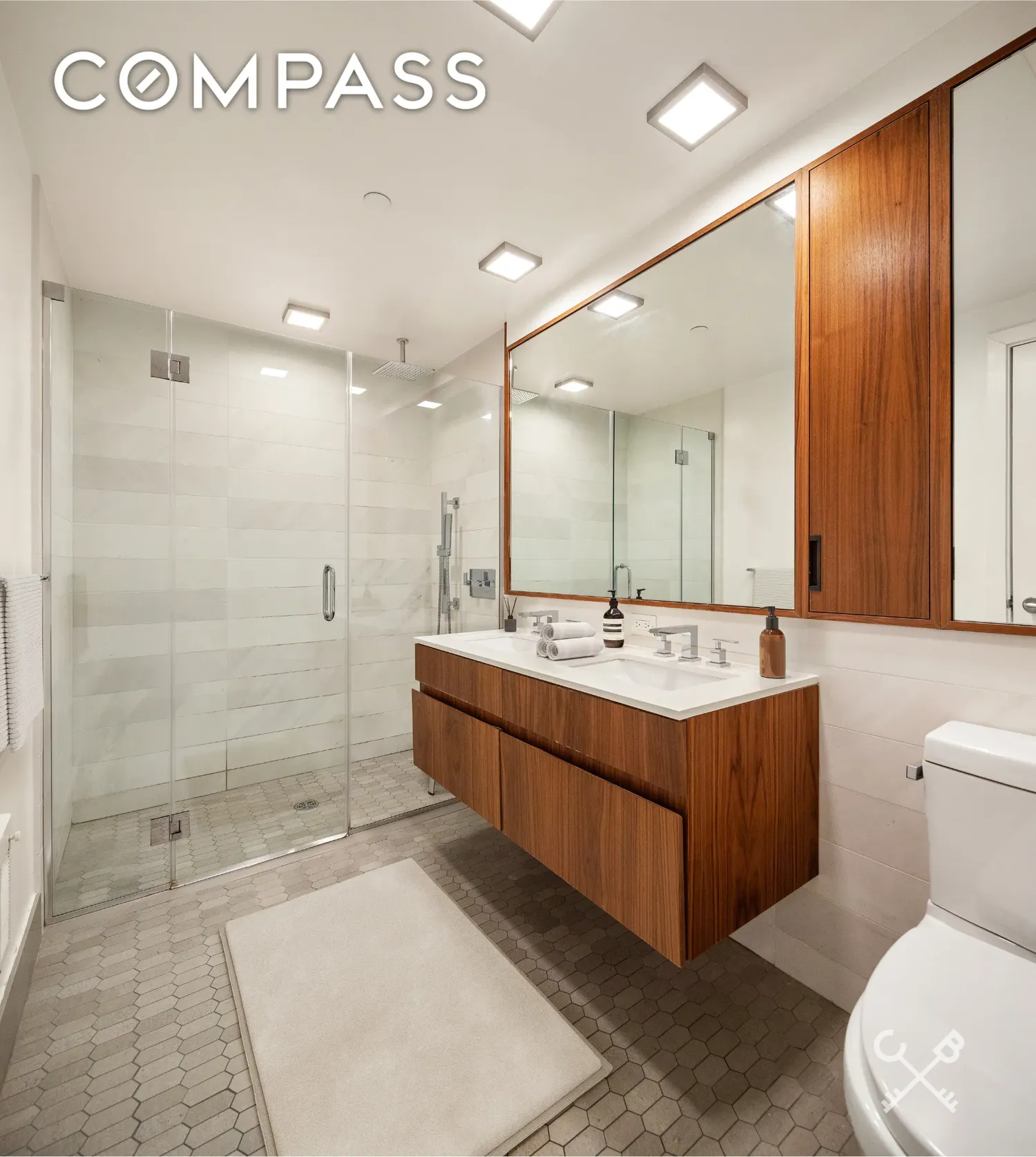 Inside, it’s all quality: 6" wide-plank oak floors, Bosch appliances, Canadian white-oak veneer lowers with white-lacquer uppers, Caesarstone Frosty Carina counters, Signature under-mount sink with Grohe faucet, and in-unit Bosch W/D. Central heat and AC keep the climate dialed. Spa-caliber baths bring walnut vanities, white Caesarstone, Signature fixtures, and a deep soaking tub.