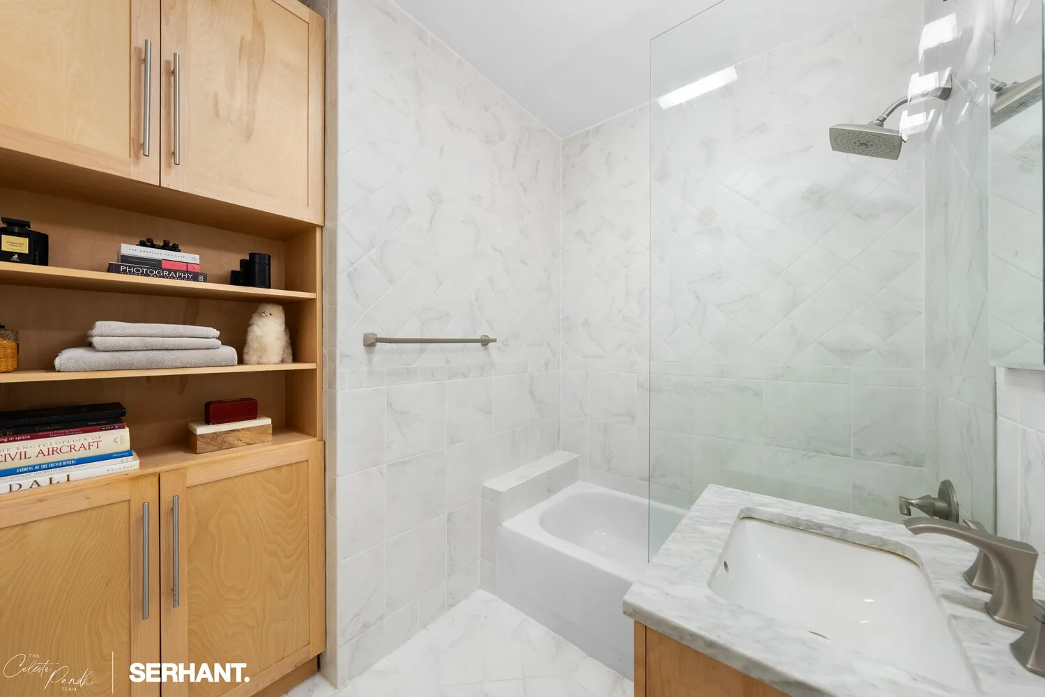 Both bedrooms are positioned along the south side of the apartment, providing excellent privacy and exceptional sunlight throughout the day. The primary bedroom offers a spacious closet, an en suite marble bathroom with a built-in linen closet, and direct access to a private south-facing balcony. The second bedroom is also generously sized, with beautiful southern light, a large closet, and convenient access to a full bathroom.