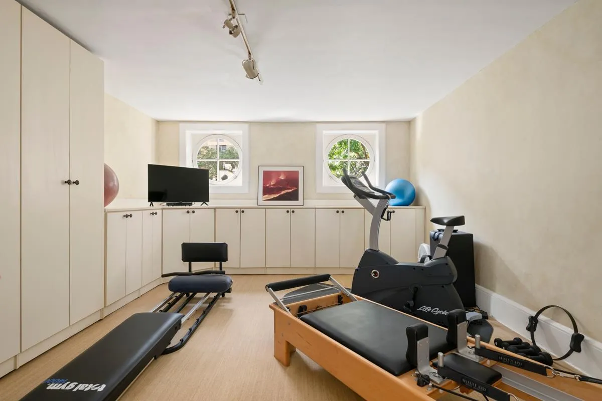 Across from the family room is a bright, south-facing bedroom, currently used as an exercise room, featuring two distinctive round porthole windows. A full bathroom completes this level.