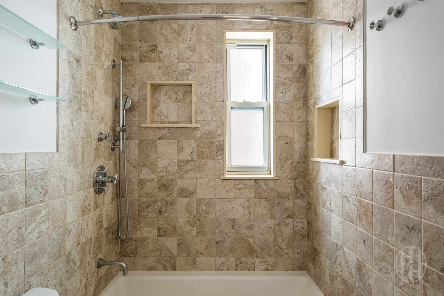 The south-facing primary bedroom accommodates a king bed + dedicated sitting area, and boasts double windows with partial river view and two custom closets. The windowed bath is replete with a custom-built single-sink double-faucet vanity, floor-to-ceiling mirrored storage cabinet, and multizone shower with elegant imported tile, for a spa-like experience.