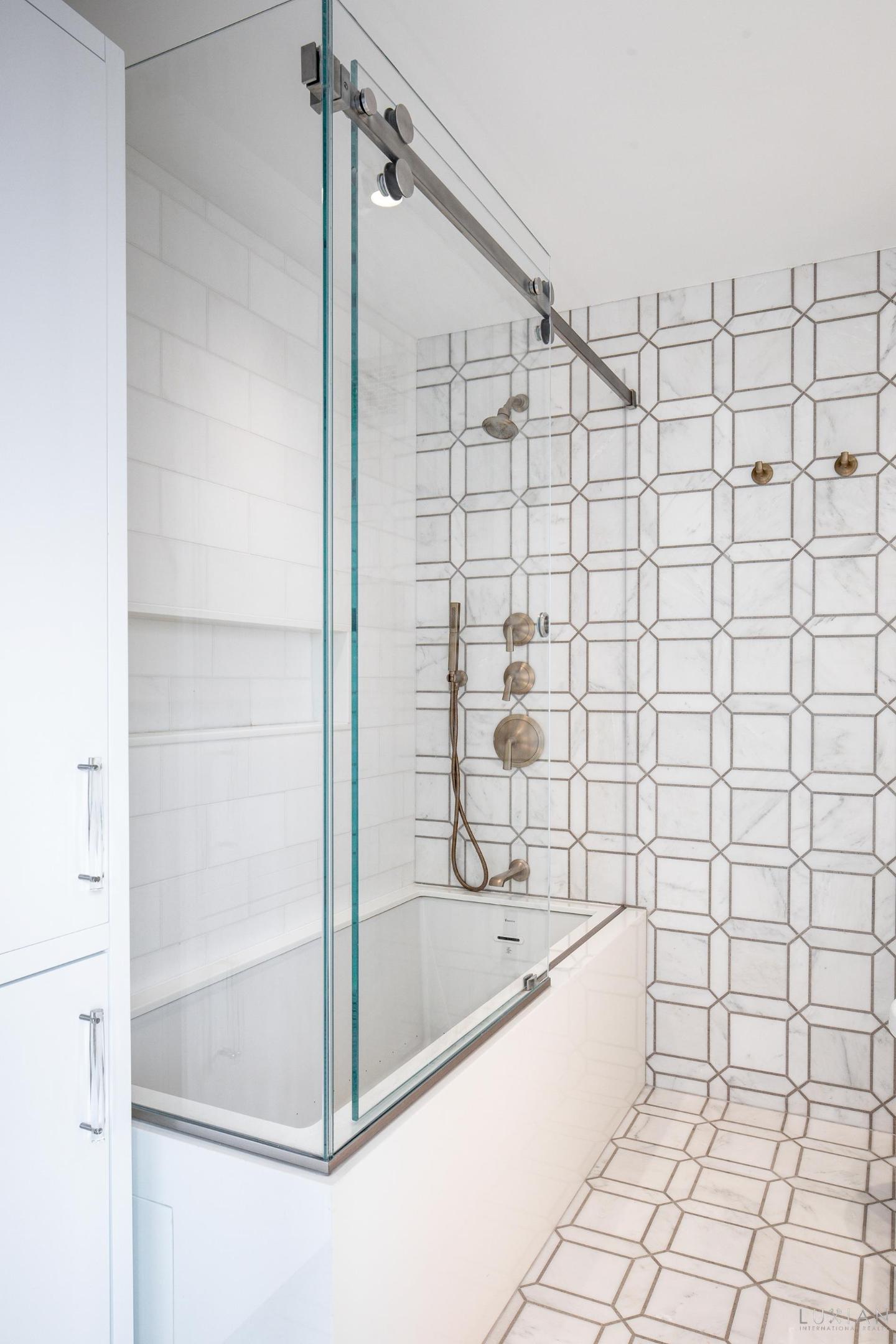 Primary Suite Sanctuary With Balcony: Enter your peaceful retreat featuring custom-built closets and an exquisite en-suite spa bathroom with an Ann Sacks marble mosaic wall, a Bainultra soaking tub, and Kallista fixtures, creating a harmonious experience of luxury and relaxation.
