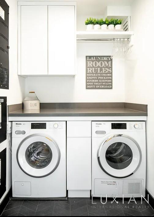 Bathrooms: Each bathroom reflects unique, high-end design, with Calacatta Viola marble sinks, Phillip Jeffries wallpaper, and Kallista Pinna Paletta fixtures. Beautifully designed details include artistic tile accents, wall-mounted Toto toilets, and chevron-patterned laundry room flooring for an elevated aesthetic throughout.