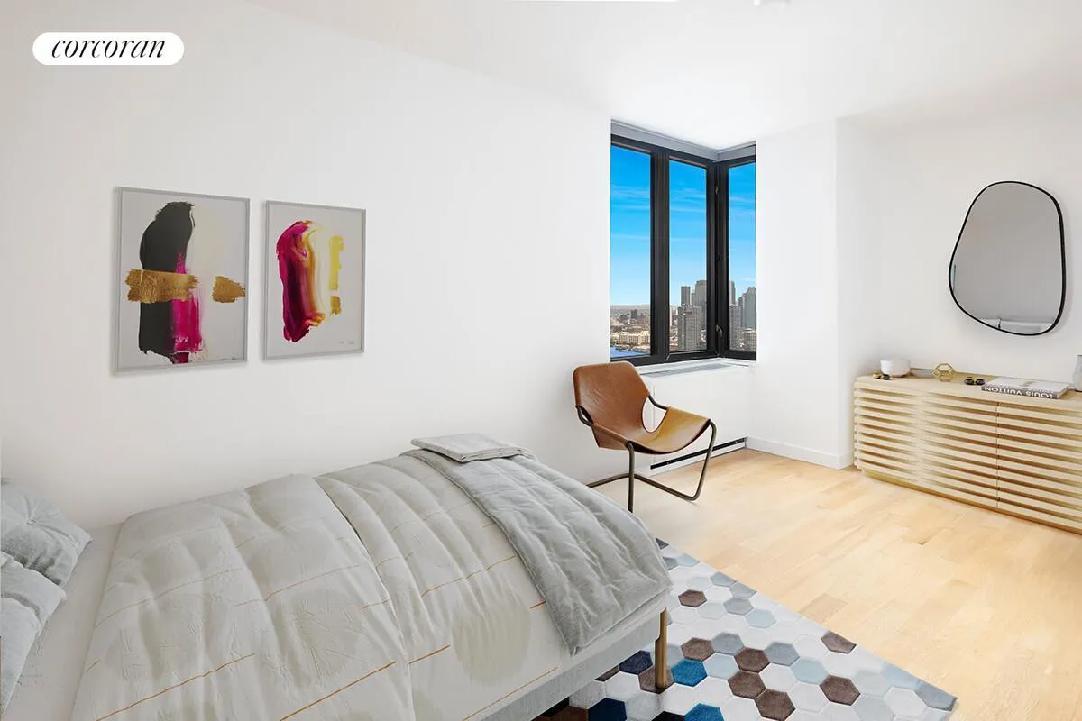 The king-sized primary suite boasts three closets and a luxurious en-suite bathroom. Step outside onto the private balcony to experience the morning sunrise and a panoramic cityscape. The second bedroom comfortably accommodates a queen-sized bed. There is in-unit washer and dryer. With low carrying costs, this condominium presents an exceptional opportunity as both a distinguished home and a savvy investment.