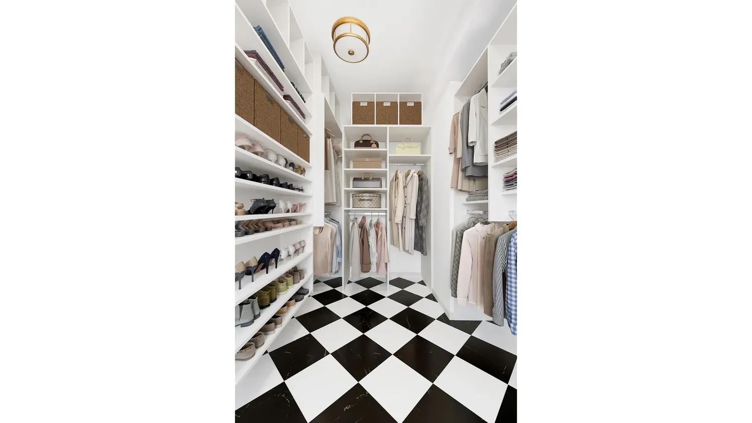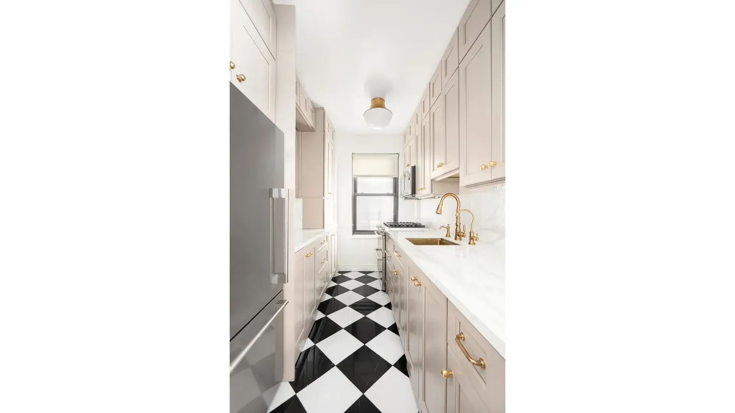 At the heart of the home is a meticulously renovated designer kitchen, completely reimagined less than two years ago. Outfitted with Carrara countertops, unlacquered brass hardware, and a premium suite of appliances including a Café double oven range and Fisher & Paykel refrigerator and dishwasher, the space is both striking and highly functional. A discreetly integrated washer/dryer further elevates everyday living.