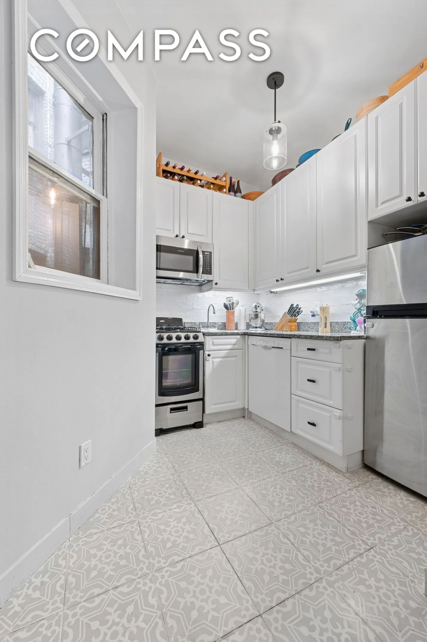 The windowed kitchen is outfitted with stone countertops, new stove, and abundant cabinetry, while the elegant bathroom boasts Kohler fixtures and classic finishes.