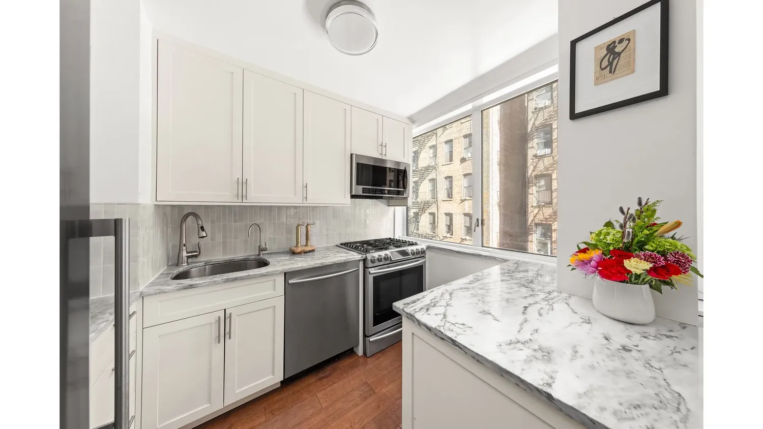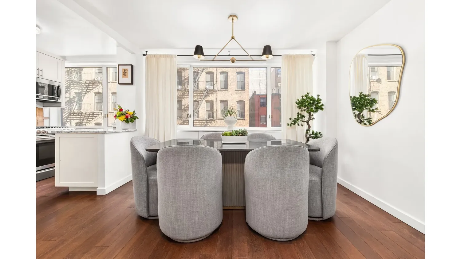 The open flow of the apartment creates a natural rhythm for modern living and entertaining, anchored by a windowed kitchen appointed with top-of-the-line Samsung stainless steel appliances, elegant quartzite countertops, and a polished gray tile backsplash. Custom deep cabinetry provides exceptional storage, while subtle under-cabinet lighting adds both warmth and practicality. Just beyond the kitchen, the dining area offers a comfortable setting for everyday meals while easily accommodating gatherings with friends and family. The space also lends itself naturally to a home office, guest area, or flexible second sleeping space.