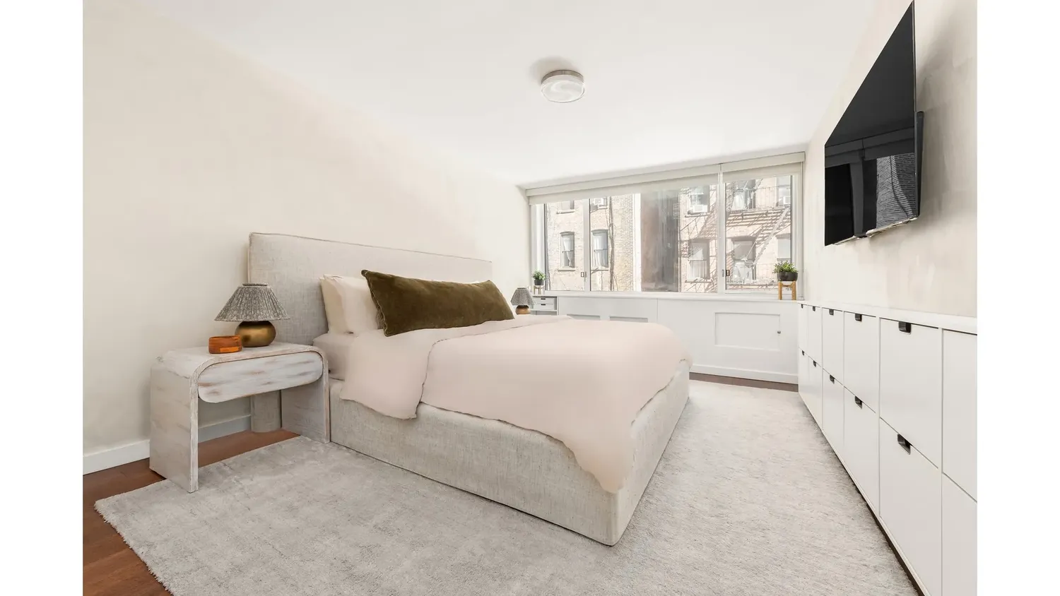 Recent enhancements throughout the apartment introduce a calm and elevated aesthetic. The foyer, hallway, and bedroom are finished in Portola Paints limewash in the color Eastwood, adding soft architectural texture and depth. Semi-gloss white walls create a crisp backdrop, complemented by all-new warm LED lighting fixtures that cast a welcoming glow throughout the residence. In the bedroom, blackout shades provide a quiet retreat from the city.