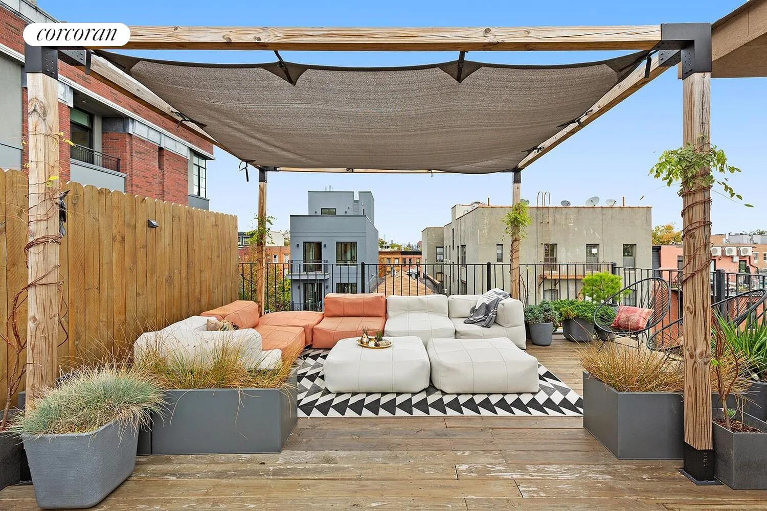 A full-length rooftop terrace crowns the home, offering panoramic neighborhood views and an ideal setting for outdoor entertaining.