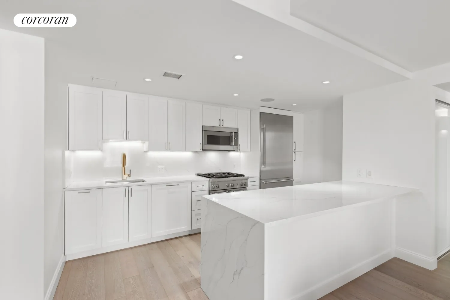 Upon entering this turnkey, Penthouse, two bedroom home you are greeted with a foyer that is typically only seen in the suburbs. Plenty of space and storage for shoes, jackets and rain gear without worrying you'd be muddying up the rest of this mint home. The living room is perfectly proportioned to have both a formal dining area as well as entertainment space all while looking north at your private terrace, the city skyline, Hudson River and Empire State Building. A fully renovated, open chef's kitchen with gorgeous white cabinetry, quartz countertop, breakfast bar and Thermador stainless steel appliances is a wonderful place to cook and entertain. The primary bedroom has double exposures showcasing both the Hudson River and the Empire State building and is outfitted with two double door custom closets and an en suite marble bathroom. The oversized second bedroom has two large windows, views of the Hudson River, two double door custom closets and direct access to the 100 sq ft terrace. Enjoy reading, gazing at the city skyline or watching the sunset over the Hudson River with friends from your sizeable open terrace. Other features of this special home include a second full marble bathroom, white oak floors throughout, upgraded soundproof windows, Nest smart thermostats and top of the line Miele washer/dryer.