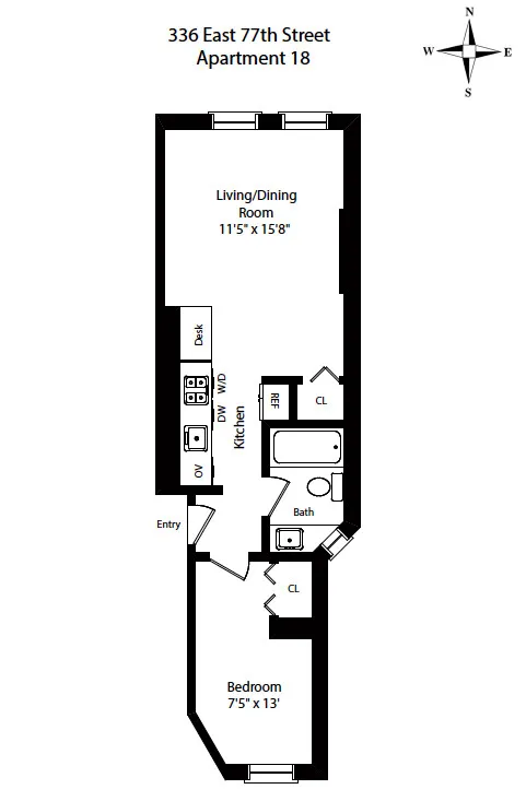 Apartment 18 is an exquisite, fullу renovated, top floor 1‐bedroom, 1-bathroom home. This sun filled apartment boasts over 9.5-foot ceilings, hardwood floors, ample closet space and unobstructed northern views. The renovated kitchen features stainless steel appliances with custom cabinetry, stone countertops and tremendous storage space. The countertop has been extended to a clever work space with additional overhead cabinetry for even more storage. More importantly, the apartment features an LG washer/dryer. The charming living room has exposed brick which has been recently sandblasted. A renovated windowed bathroom and a spacious south facing bedroom with a large closet complete the space.