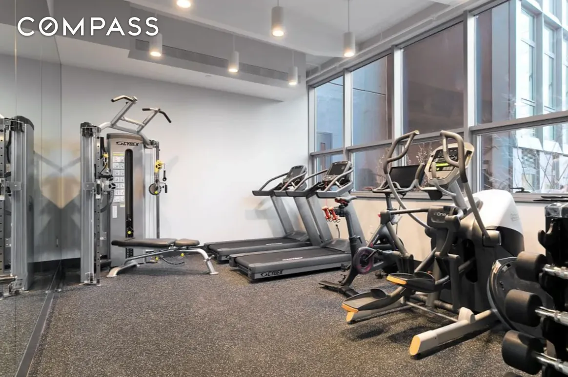 The building offers a full-service lifestyle, including a doorman, fitness center with Peloton, landscaped courtyard with fire pit, bicycle storage, and a rooftop terrace and lounge designed for both relaxation and entertaining.