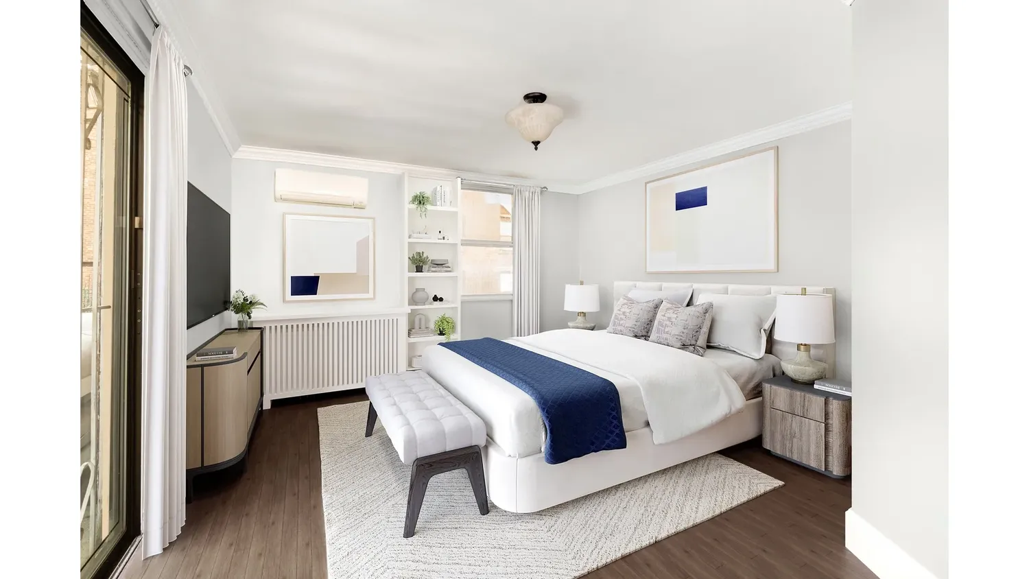 Interiors showcase timeless New York elegance, featuring an open kitchen and dining area, a wood-burning fireplace, and custom wood paneling with integrated storage that brings both warmth and function to the home. The primary suite is thoughtfully designed with a walk-in closet in the main bedroom, adding comfort and practicality to the layout.