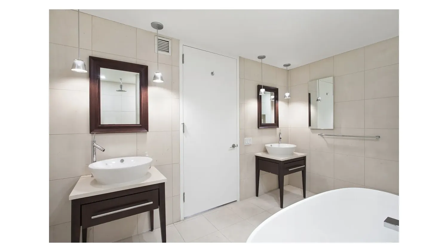 The beautiful oversized spa bathroom has double Duravit sinks, separate shower, and that gorgeous teacup bathtub.