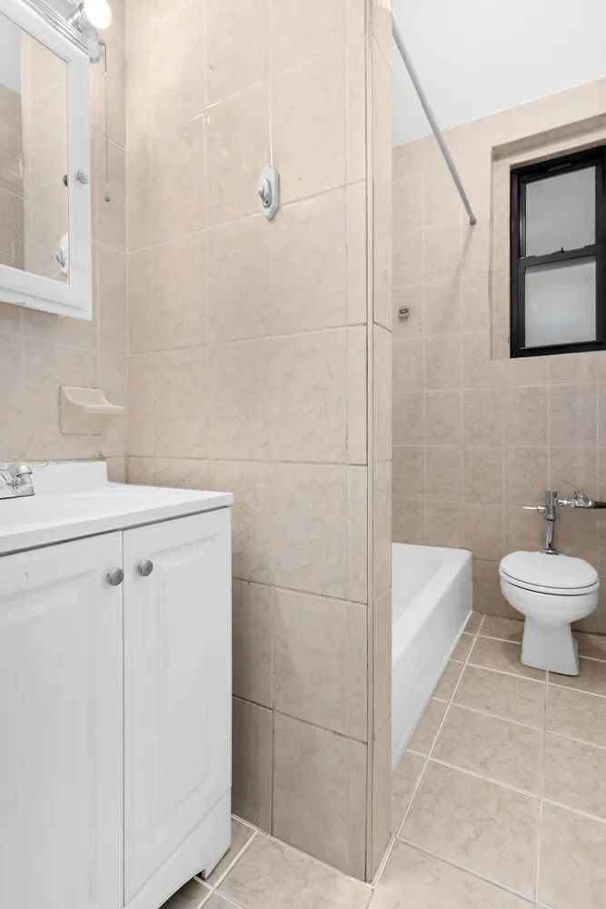 The king-size bedroom is bright and quiet, with ample space for additional furniture and storage. The windowed bathroom is clean and well-maintained, featuring classic tiled finishes and a full bathtub. Multiple closets throughout the apartment provide excellent storage.