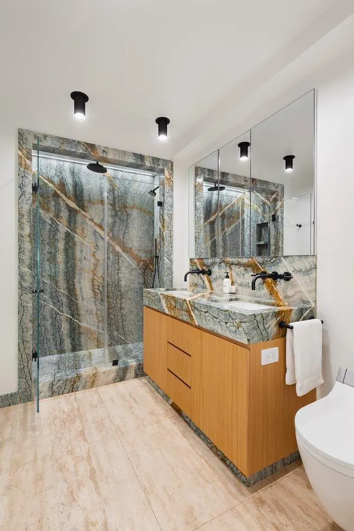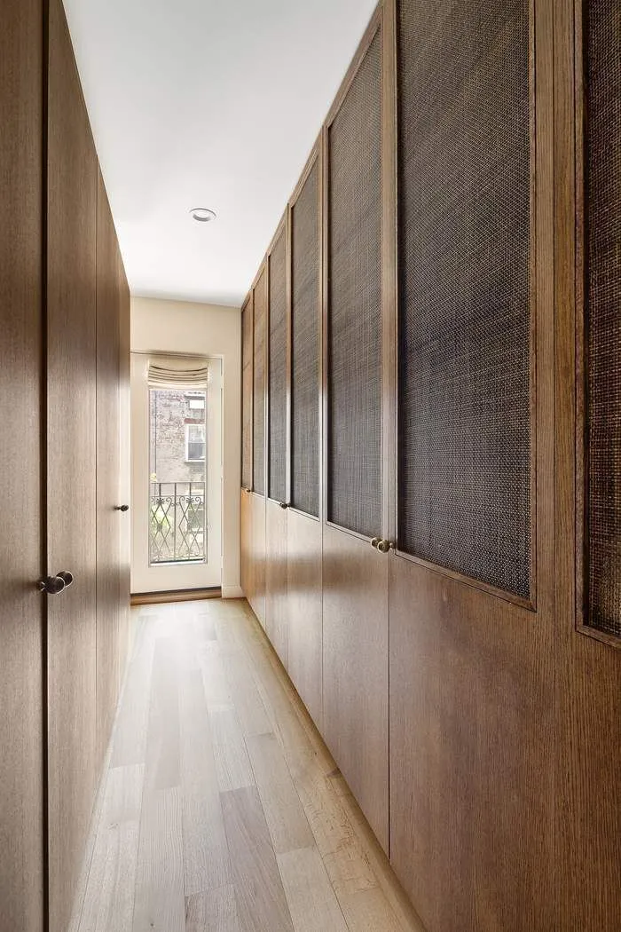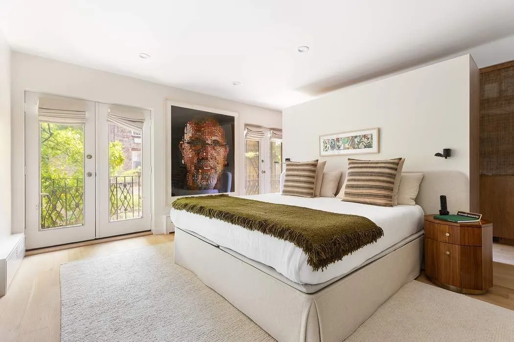 Defined by an organic modernist aesthetic, every detail of this home has been thoughtfully considered. The beautifully appointed kitchen showcases top-of-the-line appliances including a six burner Wolf range and bespoke millwork. Elegant finishes, abundant storage- featuring a discreet appliance garage-and a custom dining table that seats ten make it perfectly suited for refined entertaining. The expansive living area, defined by soaring 12 foot ceilings and oversized windows offers a serene escape. Curated stone and wood finishes, a custom curved sofa within a domed niche, and a wood burning fireplace create a warm, inviting space. Two bedrooms tucked down a hall open onto a charming New Orleans-style balcony overlooking lush brownstone gardens. Ascending the graceful, sculptural staircase, the primary suite, complete with a spa-like, en-suite bath, walk-through wardrobe, and French doors with an additional balcony-creates a seamless separation between public and private quarters.