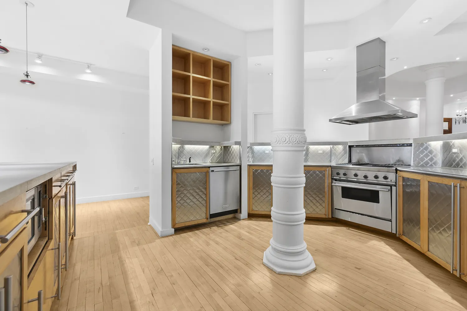 The chef's kitchen is an entertainer's dream, boasting an edgy, industrial design with stainless steel cabinetry and backsplash, Viking and Subzero appliances, and an impressive 18-foot limestone island.