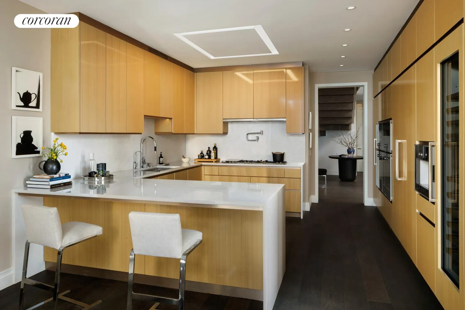 The lower level is thoughtfully designed for both living and flexibility, featuring a gracious Great Room that opens directly to a 203 SF private terrace, ideal for indoor-outdoor entertaining. The windowed eat-in kitchen is appointed with bespoke Smallbone of Devizes cabinetry, opal white marble countertops and backsplash, and a full suite of Gaggenau appliances including a wine refrigerator and coffee maker. Also on this level is a large media room, which easily converts